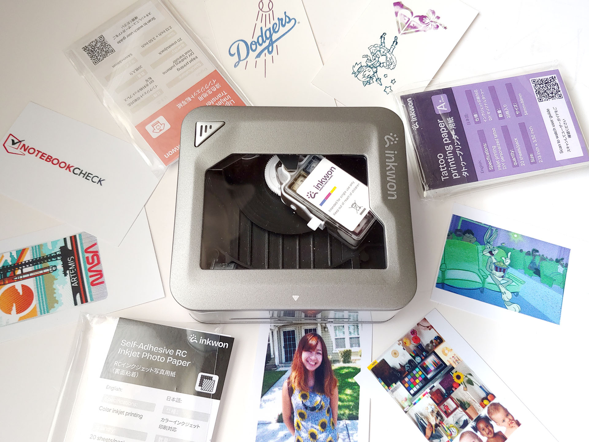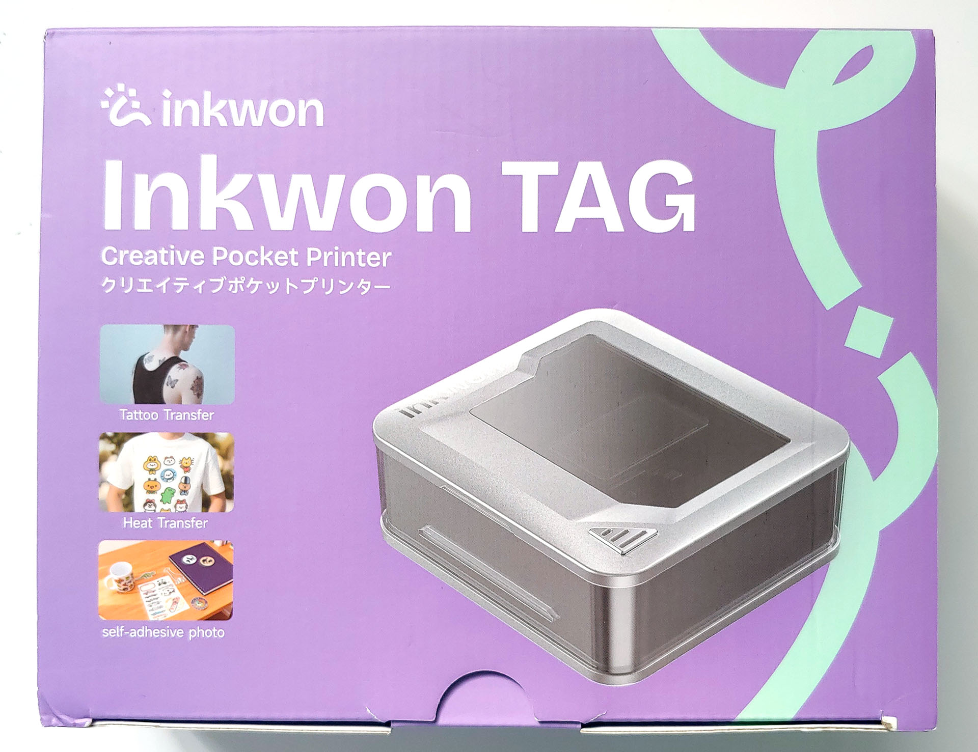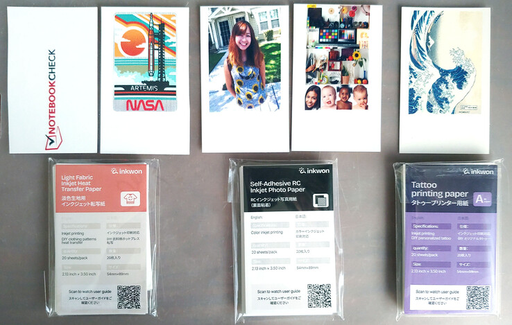 L'Inkwon Tag è dotato di tre tipi di carta - Trasferimento termico del tessuto leggero, Carta fotografica autoadesiva e Carta tatuaggio - che consentono un'ampia gamma di usi creativi. Il kit campione comprendeva anche degli articoli per provare gli adesivi da stirare.