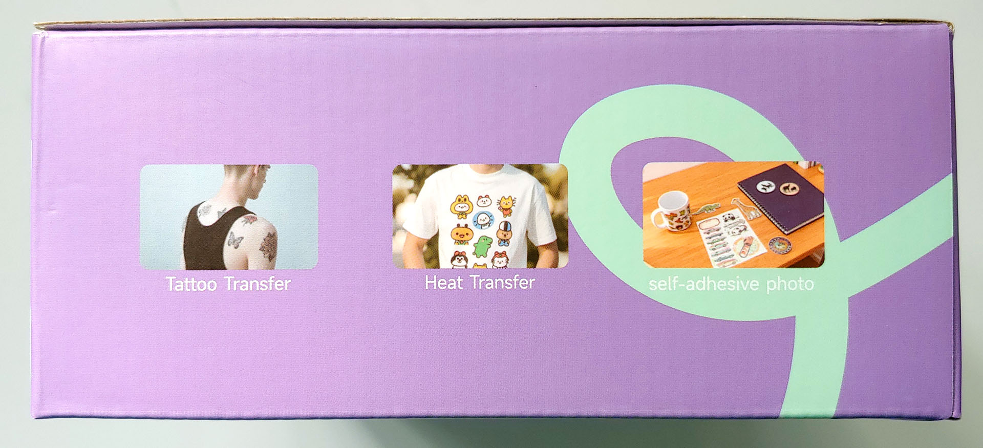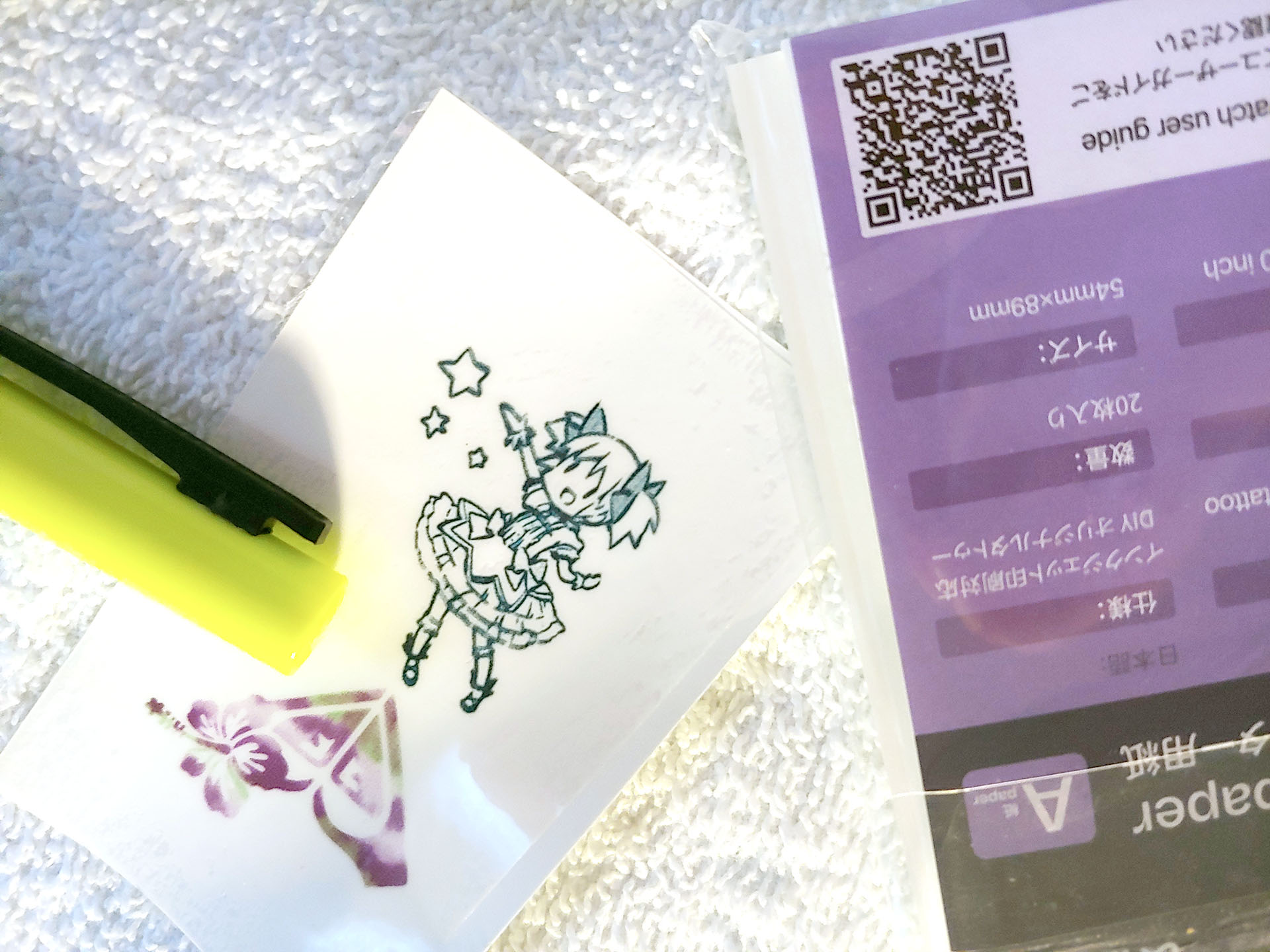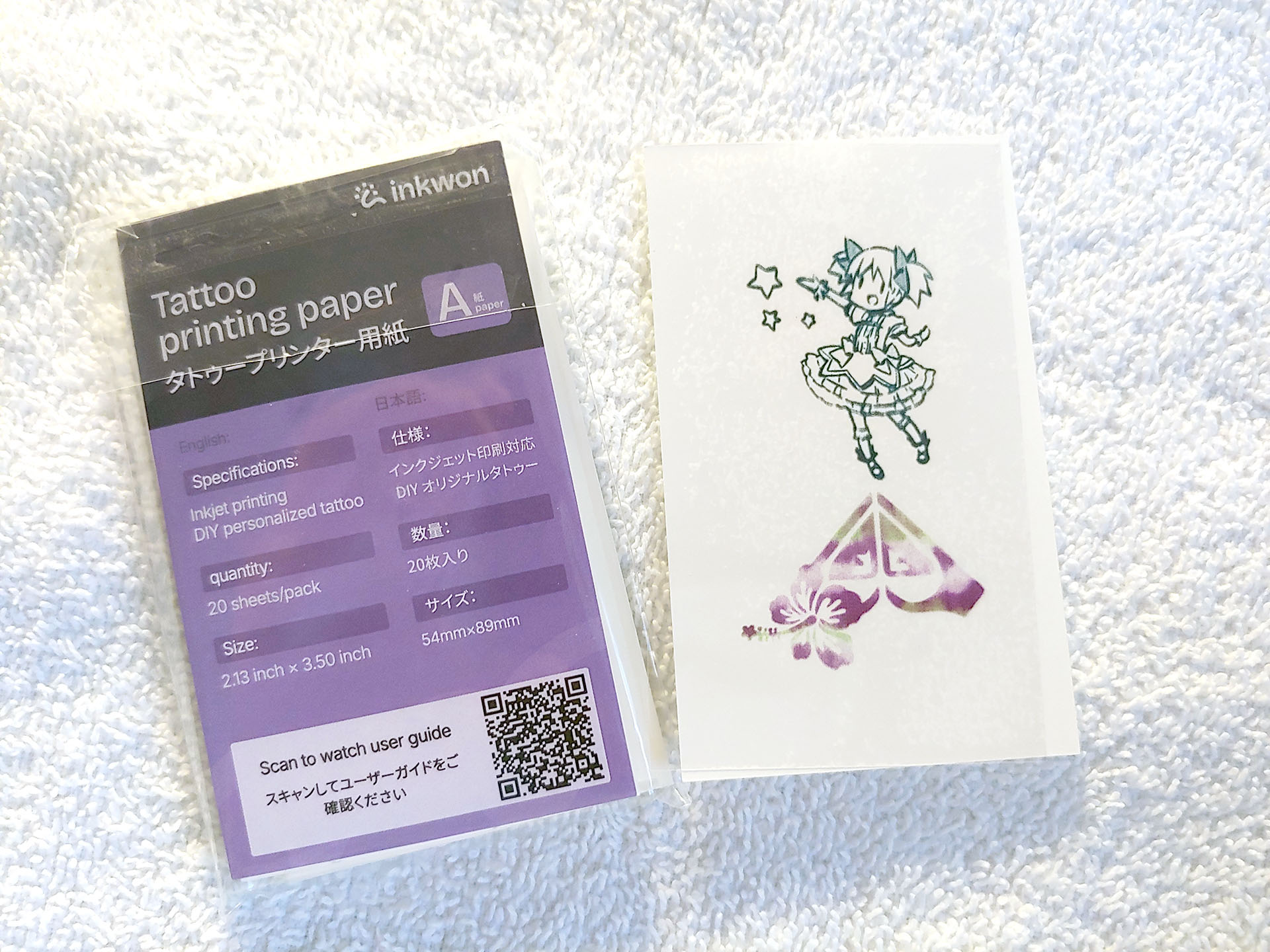 L'Inkwon Tag è dotato di tre tipi di carta - Trasferimento termico del tessuto leggero, Carta fotografica autoadesiva e Carta tatuaggio - che consentono un'ampia gamma di usi creativi. Il kit campione comprendeva anche degli articoli per provare gli adesivi da stirare.