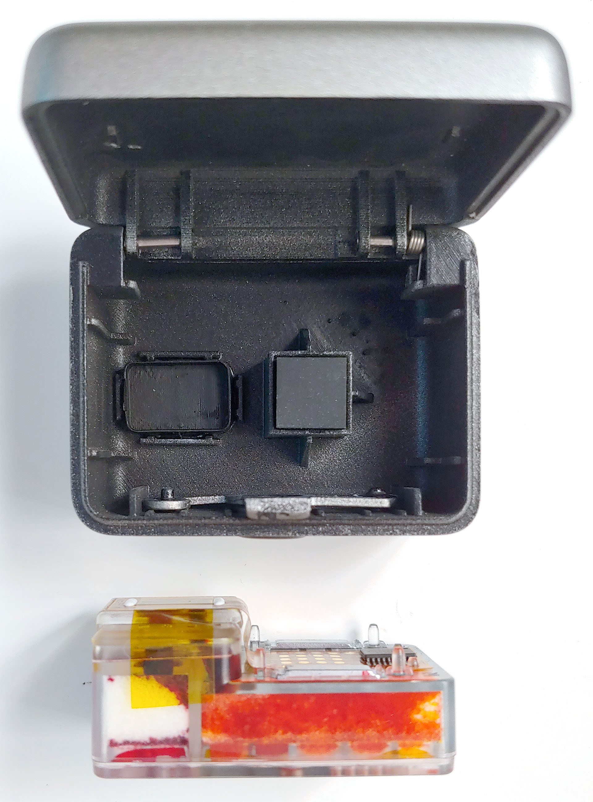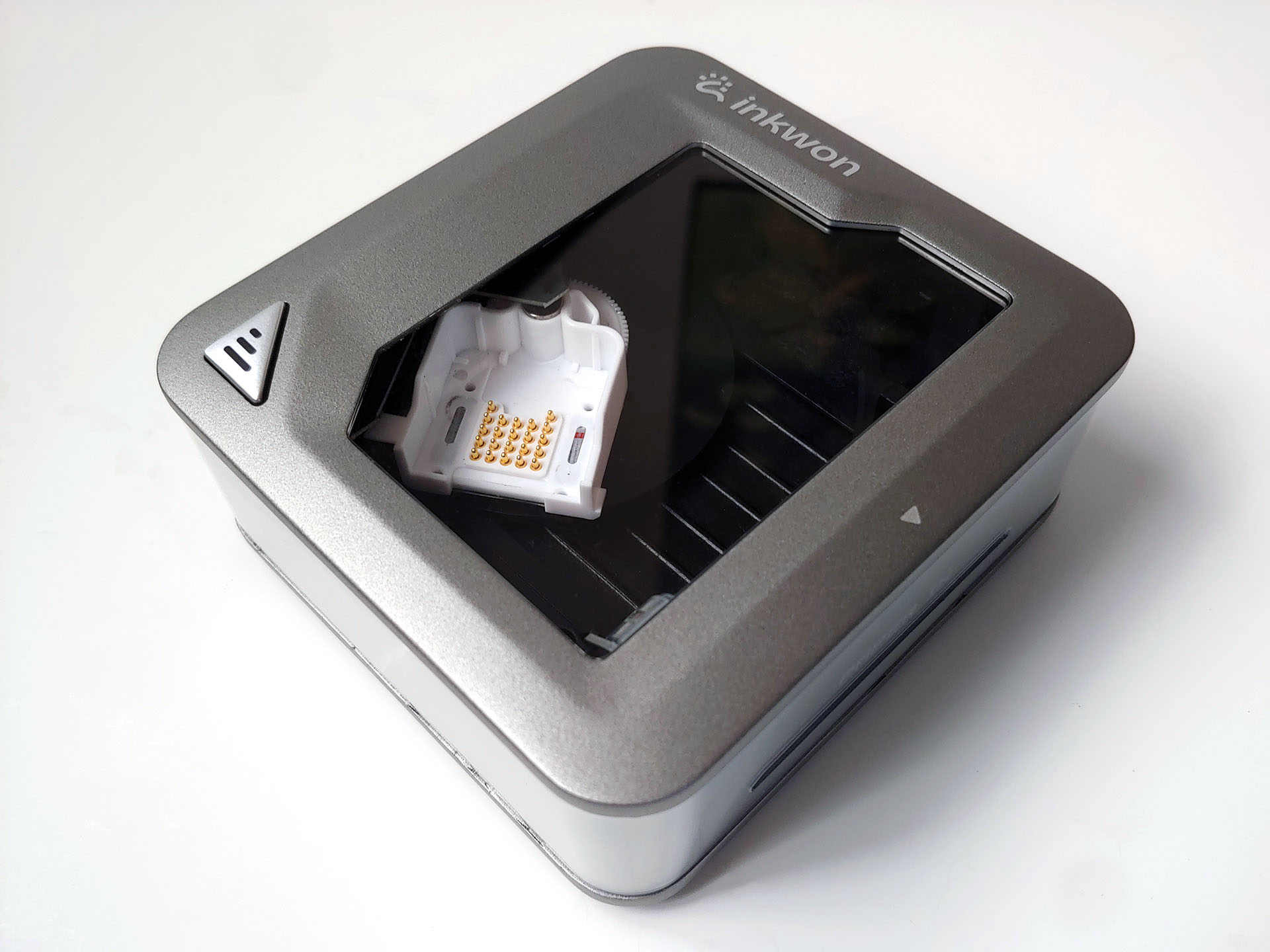 Il coperchio magnetico trasparente di Inkwon Tag si rimuove facilmente, rivelando una cartuccia che spazia da un lato all'altro durante la stampa.