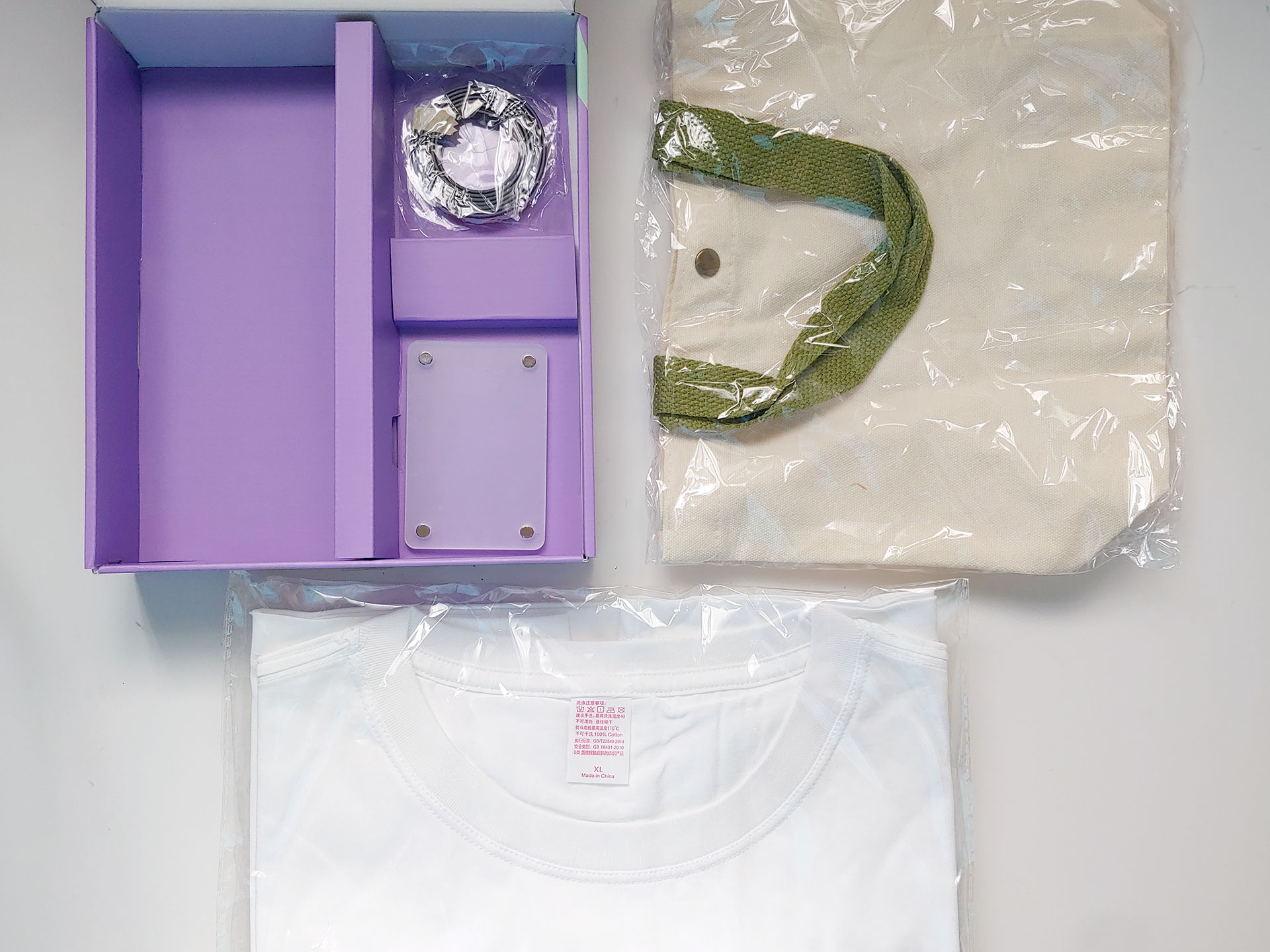 È stato fornito un kit campione, che comprendeva una maglietta bianca, una borsetta, un portafoto magnetico e un magnete flessibile.