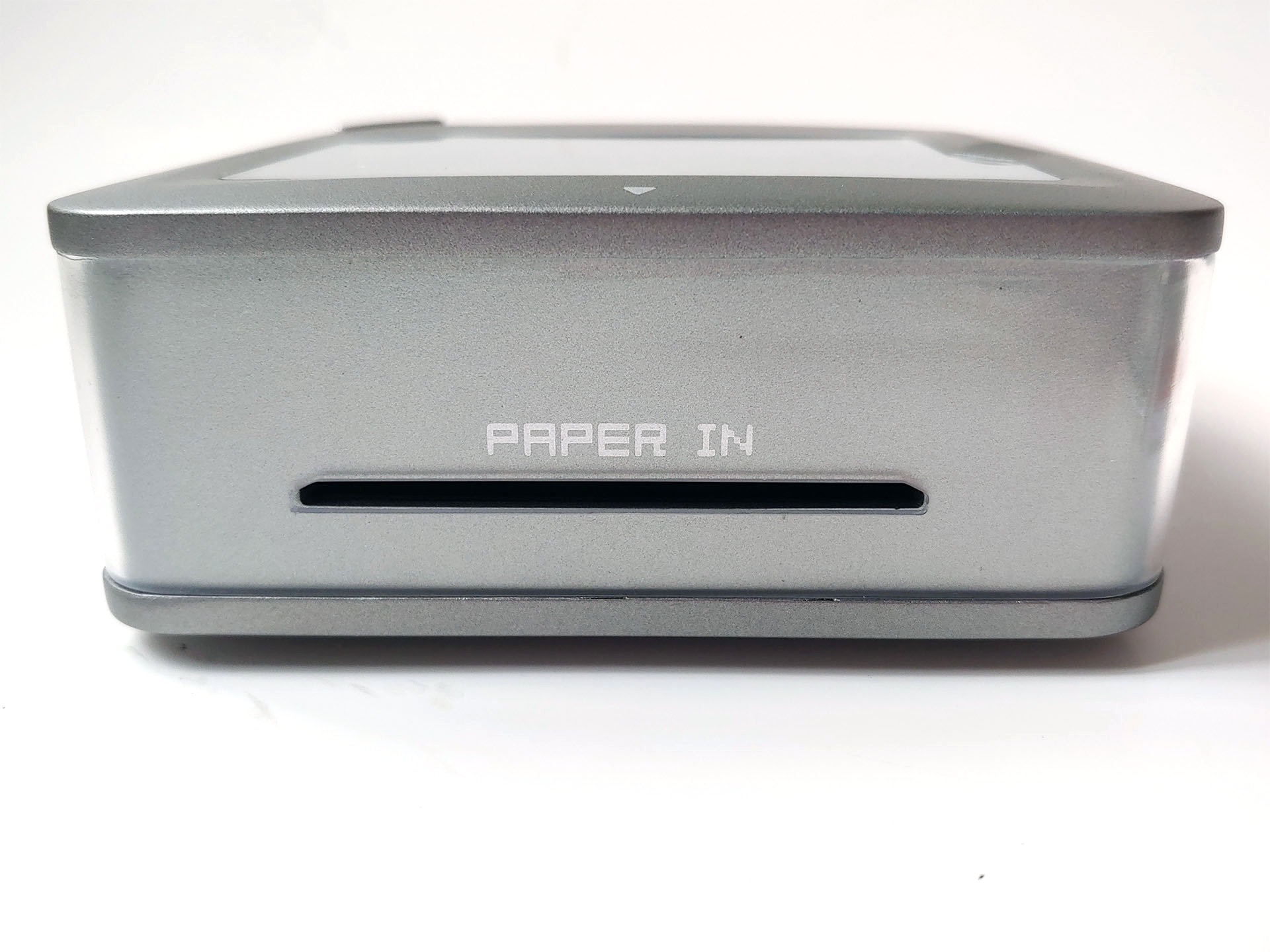 Gli slot per la carta opposti gestiscono l'alimentazione automatica, con un foro di reset, una porta USB-C e un coperchio per l'inchiostro di scarto su un altro lato. La stampante compatta si adatta comodamente alle tasche delle giacche grandi o alle borse piccole.
