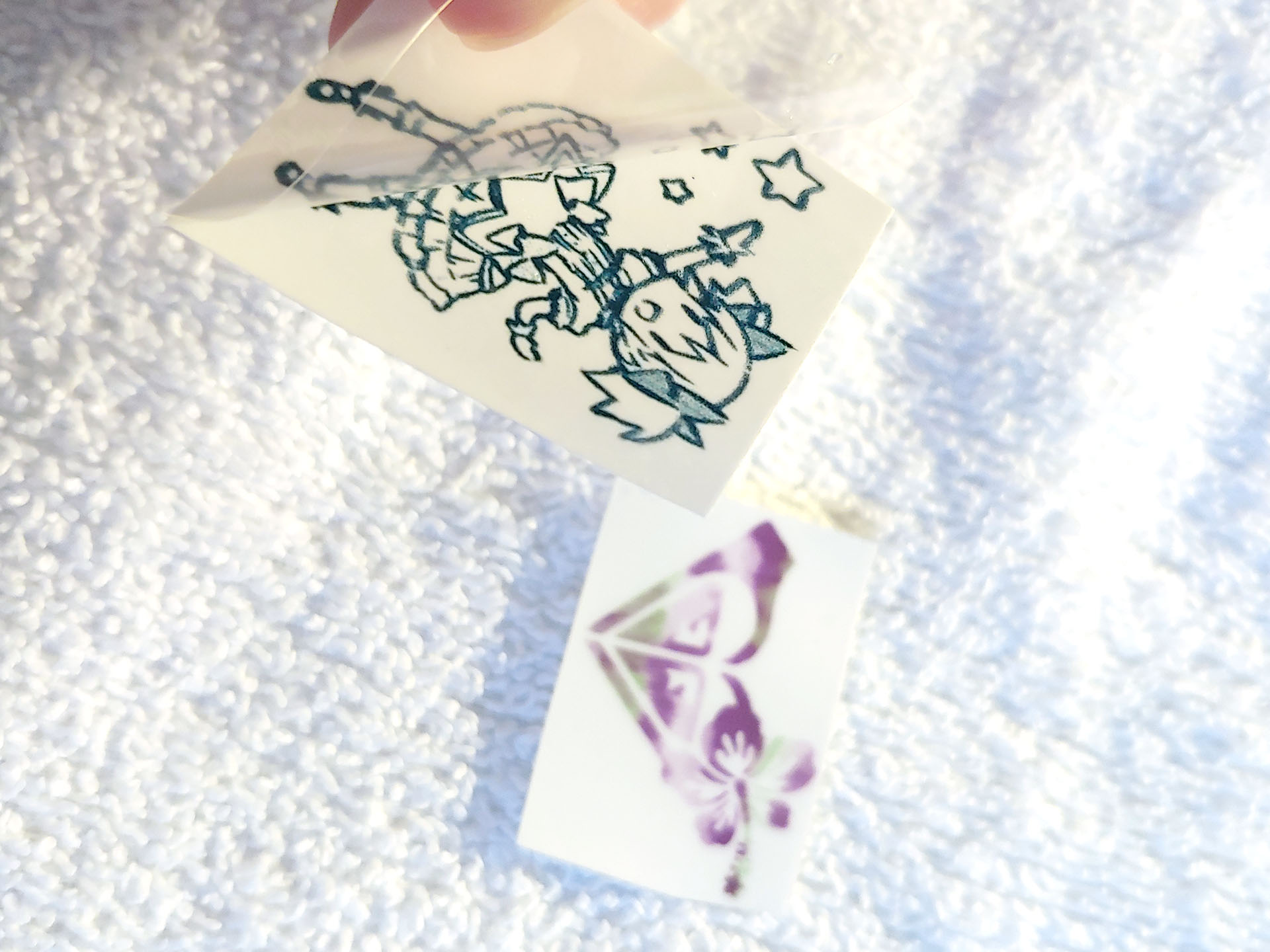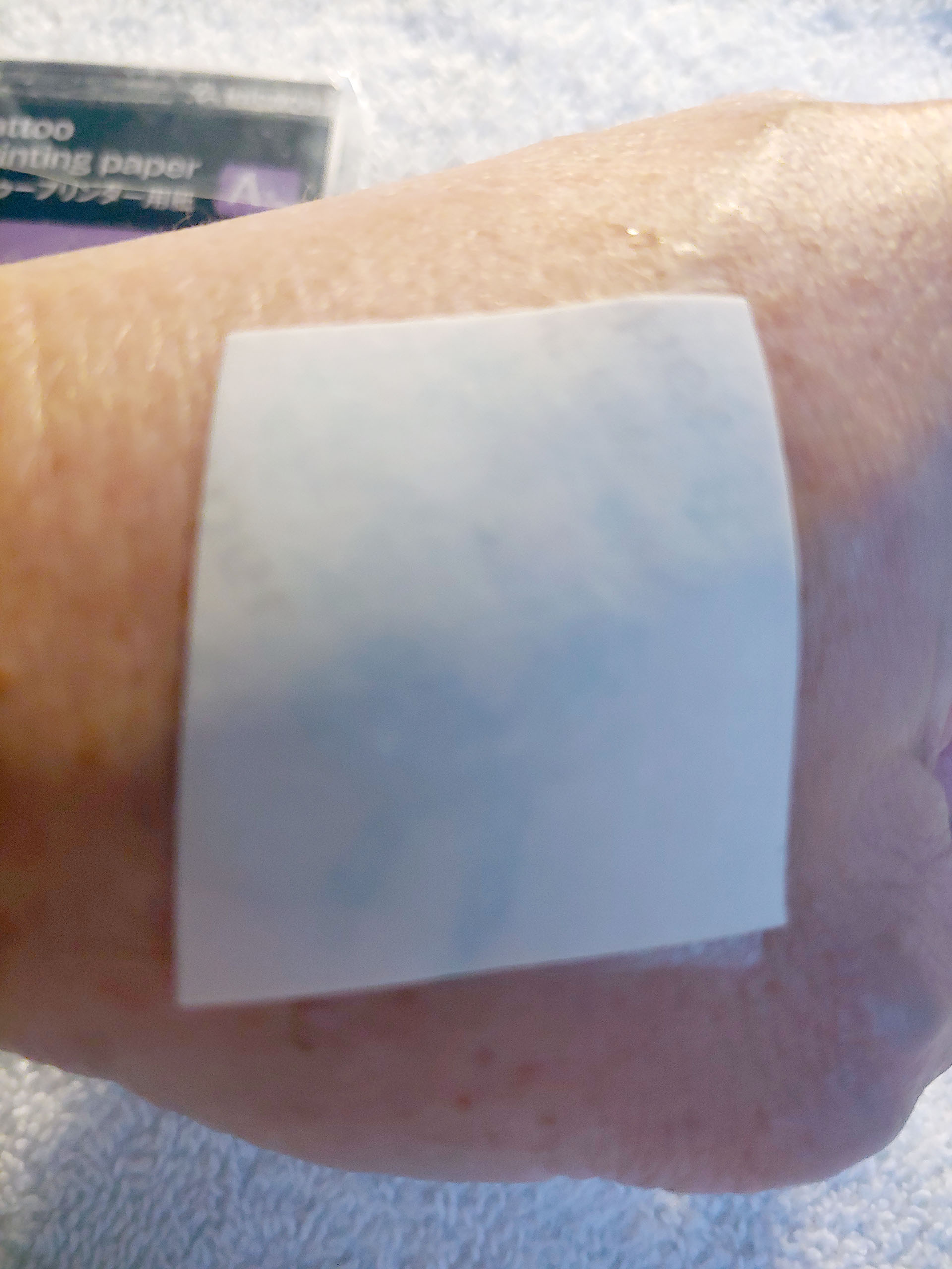 Applichi il foglio adesivo trasparente sopra la stampa del tatuaggio, strofini per rimuovere le bolle d'aria, ritagli e stacchi il foglio trasparente.