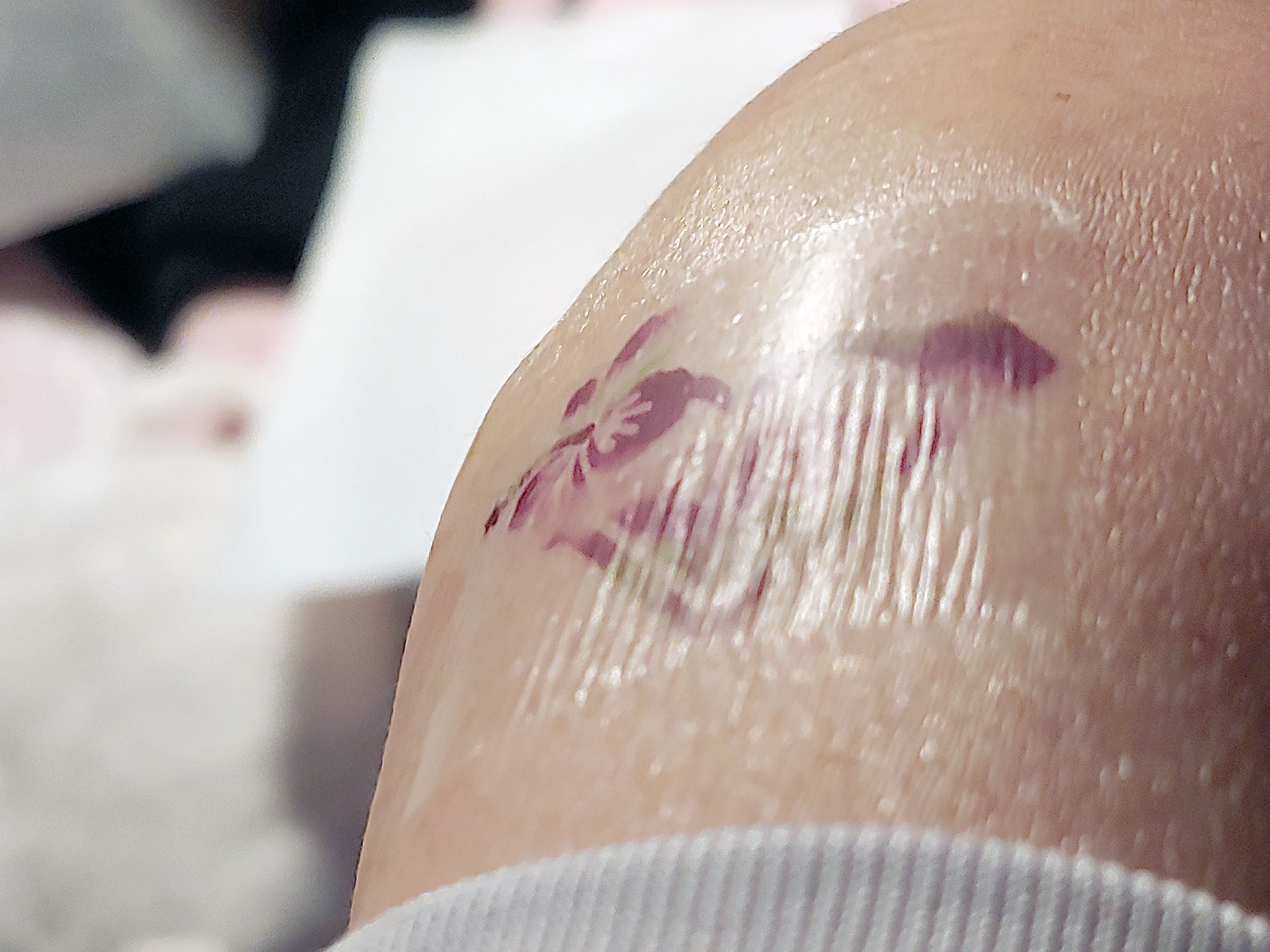 Il tatuaggio mantiene la qualità e il colore della stampa originale. Uno strato superiore trasparente conferisce un aspetto lucido e non si allunga come la pelle, quindi la flessione può creare leggere increspature. Il tatuaggio è resistente all'acqua ma non impermeabile, e una doccia calda e insaponata romperà l'adesivo.