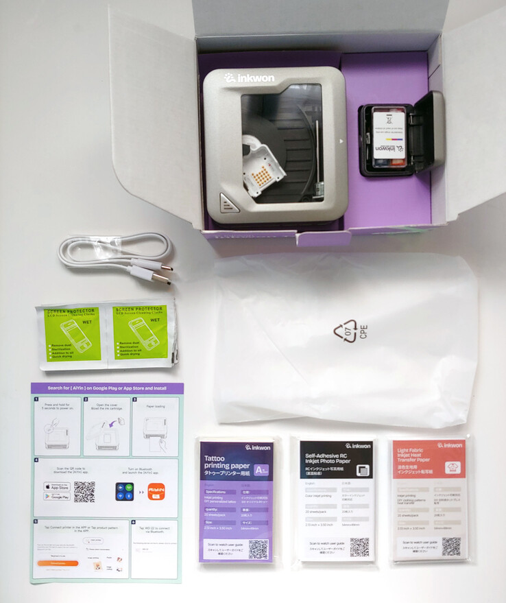 La confezione comprendeva la stampante Inkwon Tag, una guida rapida, un cavo di ricarica USB-C, una cartuccia a getto d'inchiostro e un supporto per la cartuccia, panni per la pulizia della testina di stampa e un set di carte adesive, per tatuaggi e per trasferimenti.