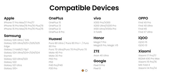 Sebbene Insta360 pubblicizzi Snap con gli iPhone, il nuovo accessorio è compatibile anche con gli smartphone Android dotati di porte USB Type-C. Per un elenco completo dei dispositivi ufficialmente compatibili, consulti l'immagine sottostante. Il prezzo di Insta360 Snap parte da 79,99 dollari e sale a 89,99 dollari con una luce integrata. Consulti il sito web Insta360 per maggiori dettagli.