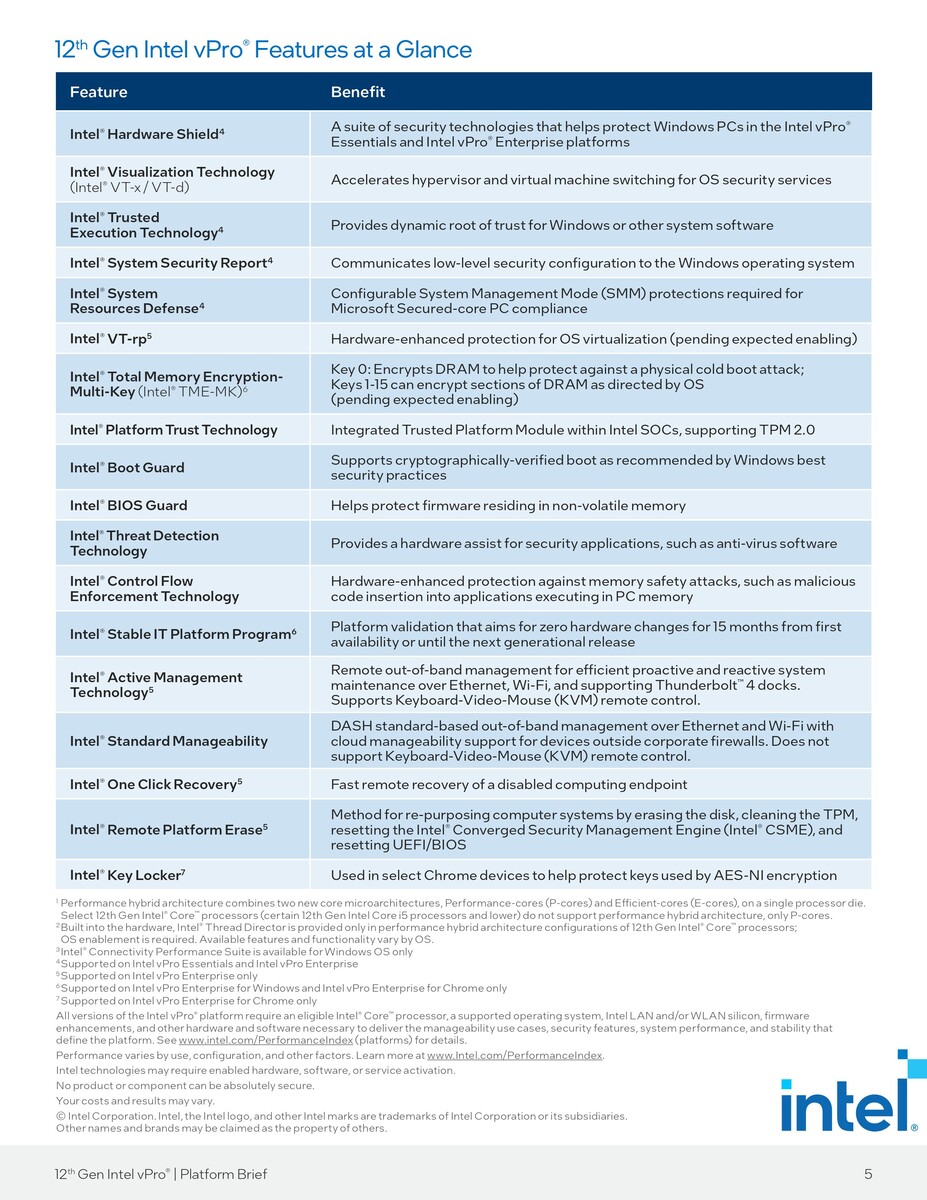 Intel ha detto che più di 150 progetti vPro possono essere attesi quest'anno, compresi quelli conformi a Evo. Questi progetti saranno caratterizzati da processori idonei di 12° gen, Intel Wi-Fi 6E e Connectivity Performance Suite, supporto per la memoria ECC e Thunderbolt 4.