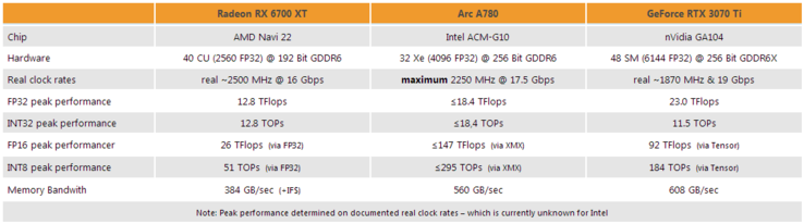 Se i clock di boost VRAM a 1093 MHz sono corretti per l'ARC A780, stiamo cercando 17,5 Gbps GDDR6 che è un po' più veloce di quello che AMD e Nvidia offrono per i loro modelli di fascia media. Inoltre, i vociferati 4096 core FP32 sulla SKU A780 dovrebbero consentire le migliori prestazioni di picco INT32, FP16 e INT8 attraverso l'architettura XMX, battendo facilmente le soluzioni simili di AMD e Nvidia.