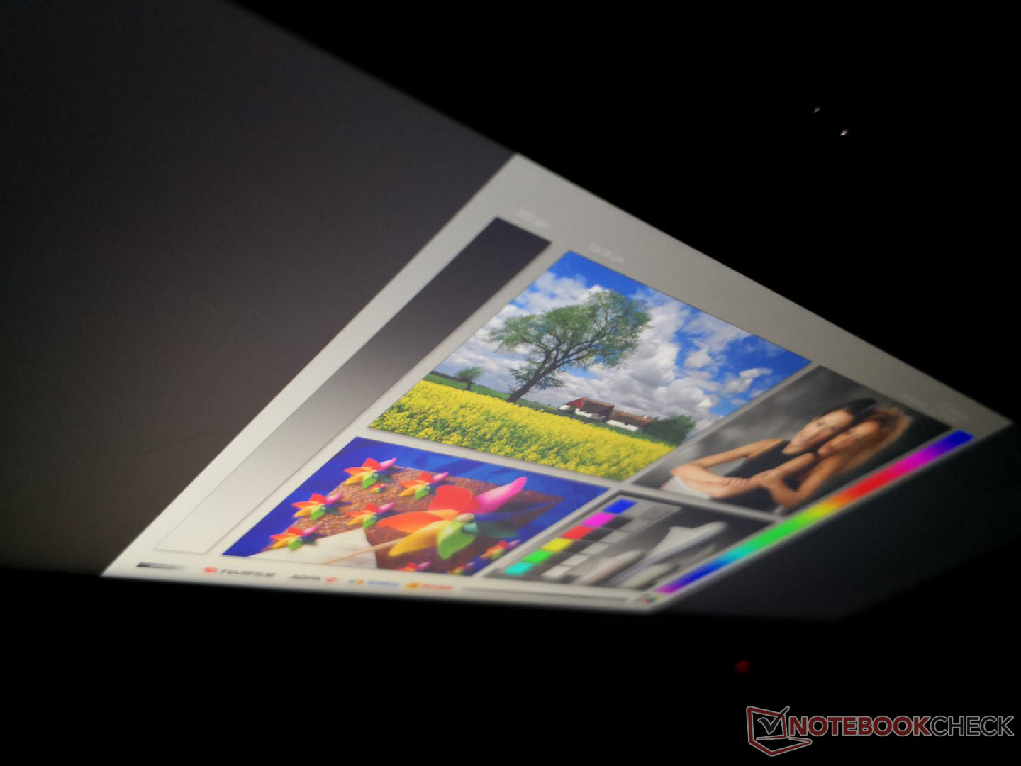 Il nuovo display 4K a 120 Hz è migliorato significativamente rispetto al display 4K a 60 Hz del GX550 dell'anno scorso, oltre all'ovvio aggiornamento della frequenza di aggiornamento. In particolare, i tempi di risposta sono migliorati notevolmente da 30 ms sul GX550 a soli 3 ms a 5 ms sul nuovo pannello. Il gioco e i movimenti del cursore sono notevolmente più fluidi e quasi senza ghosting per una migliore esperienza di gioco. Lo spazio colore e la luminosità rimangono abbastanza invariati gen-to-gen mentre il contrasto è leggermente diminuito, ma questo è un piccolo prezzo da pagare se si considerano i vantaggi ottenuti.