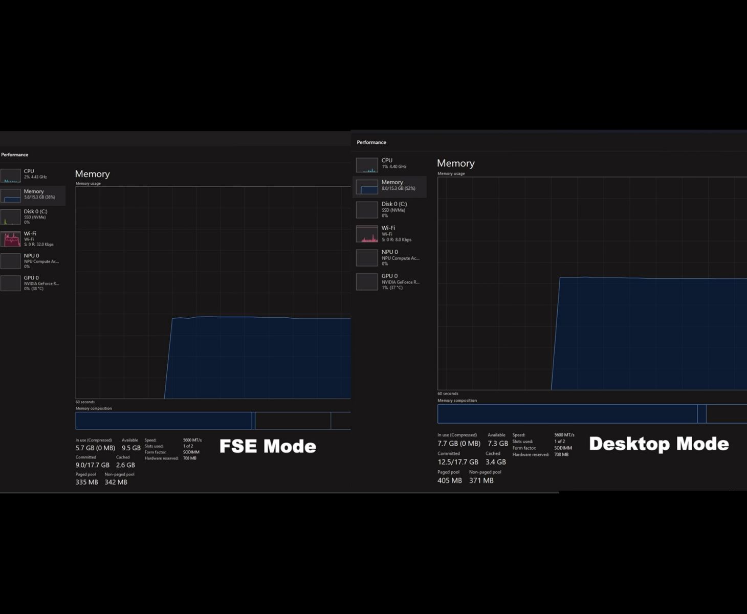Un aspetto notevole di FSE è la sua capacità di sospendere l'ambiente desktop standard di Windows, riducendo i processi in background e diminuendo l'utilizzo complessivo della memoria. Nei test mostrati dallo YouTuber, un computer portatile da gioco equipaggiato con una Nvidia GeForce RTX 5050 ha utilizzato circa 5,7 GB di RAM in FSE rispetto a 7,7 GB in modalità desktop normale, in linea con la dichiarazione di Microsoft di circa 2 GB di memoria Microsoft di circa 2 GB risparmiati. Questa riduzione può avvantaggiare in modo significativo i sistemi con memoria limitata o le configurazioni grafiche integrate che si affidano alla RAM condivisa.