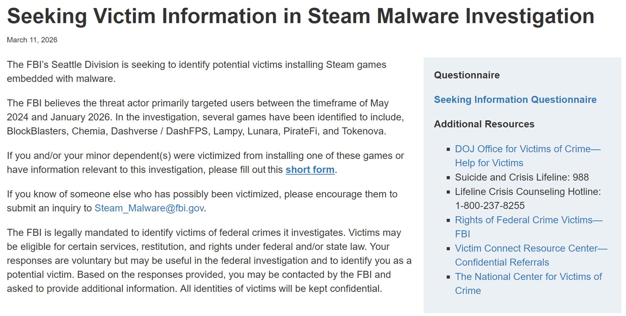 Dopo una serie di giochi Steam infettati da malware sono emersi negli ultimi anni, l FBI ha preso nota. Sul suo sito web https://www.fbi.gov/how-we-can-help-you/victim-services/seeking-victim-information/seeking-victim-information-in-steam-malware-investigationelenca una serie di titoli colpiti e chiede alle vittime di inviare un modulo con ulteriori informazioni. Valve ha anche verificato che il messaggio è legittimo e suggerisce ai giocatori di aiutare le indagini.
