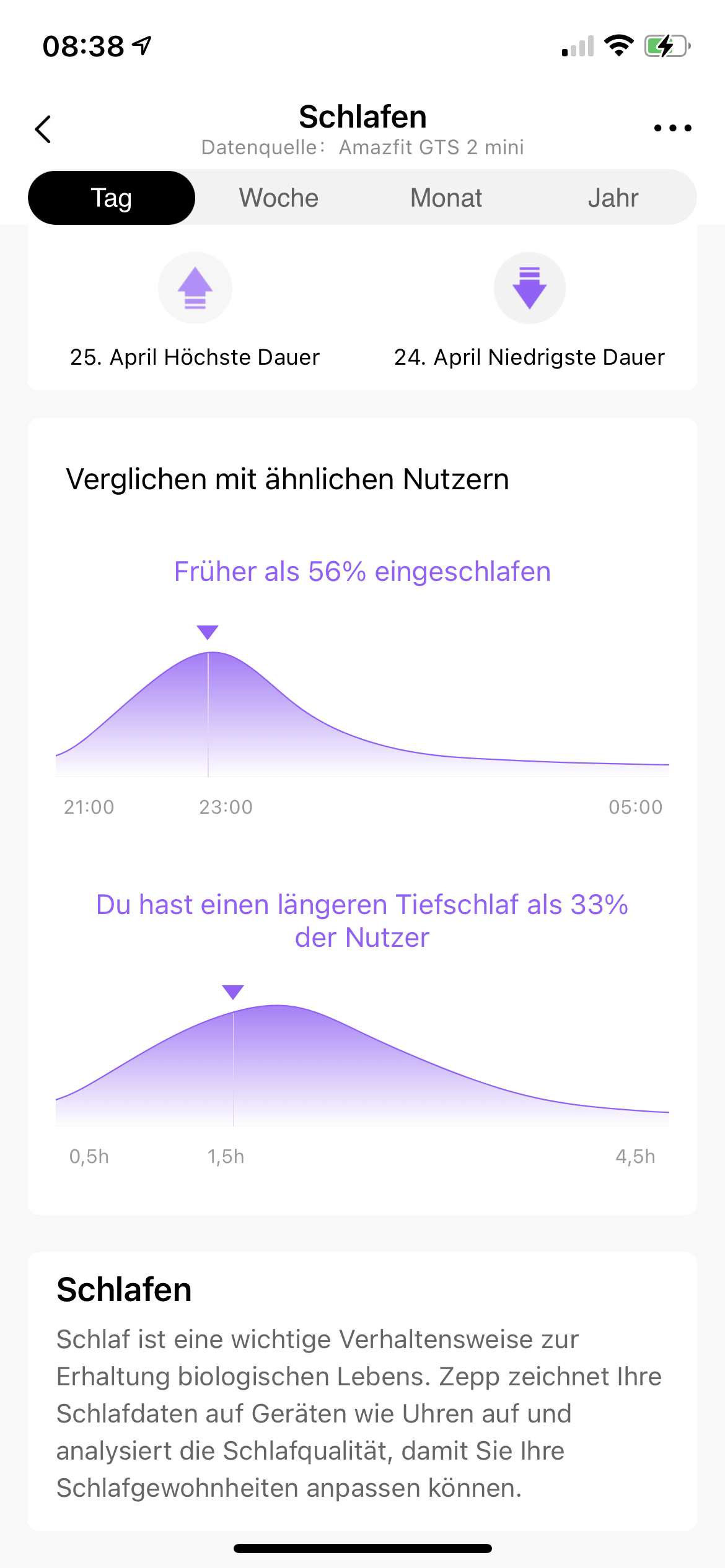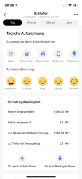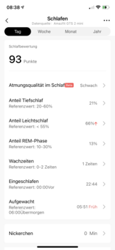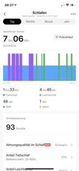 L'Amazfit GTS 2e registra l'ora in cui l'utente si addormenta e si sveglia e analizza le fasi del sonno. Se si confronta il registro della stessa notte con quello dell'Amazfit GTS 2 mini, ci sono differenze anche qui, nonostante entrambi i dispositivi utilizzino la stessa impostazione per l'intensità della misurazione delle pulsazioni. Anche dopo aver scambiato le cinghie tra il polso destro e sinistro, sembra che l'Amazfit GTS 2e tenga traccia del sonno in modo più preciso rispetto all'Amazfit GTS 2 miniHuami Amazfit GTS 2 mini im Test: Funktionale und derzeit reduzierte Smartwatch mit Alexa.