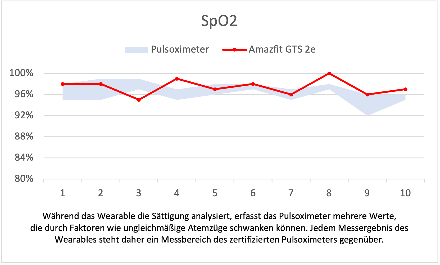 Abbiamo registrato entrambi i segni vitali più volte in parallelo con un dispositivo di misurazione certificato. Con un solo errore, la frequenza cardiaca misurata si discosta solo leggermente dalla misurazione ottenuta con il pulsossimetro certificato dal medico; la deviazione media è di 0,8 bpm. La saturazione di ossigeno registrata è per lo più all'interno dell'intervallo di misurazione del pulsossimetro. La deviazione maggiore nel test è stata di 2 punti percentuali.