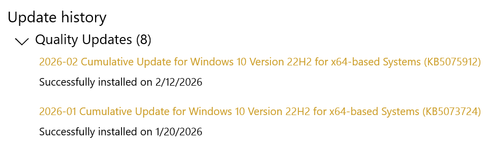 L'aggiornamento di sicurezza di Microsoft del 10 febbraio 2026 per gli Aggiornamenti di Sicurezza Estesi (ESU) di Windows 10 è KB5075912che porta la versione 22H2 di Windows 10 alla OS Build 19045.6937 (e la 21H2 alla 19044.6937).