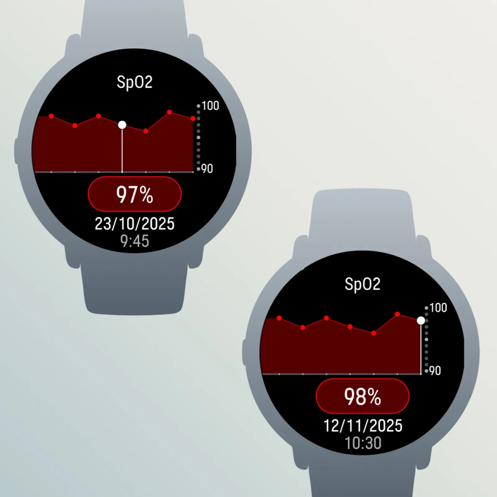 L'aggiornamento dello smartwatch introduce principalmente funzioni di convenienza. Con Polar OS 5, è ora possibile impostare allarmi multipli direttamente sullo smartwatch, e le watch face ottengono una modalità notturna. Finché la modalità "Non disturbare" è attivata, il display si illumina solo un po' quando viene premuto un pulsante, mentre alcune watch face possono ora mostrare un formato orario più minimalista. Inoltre, un nuovo grafico può visualizzare la saturazione di ossigeno nel sangue nel tempo.