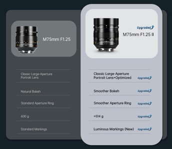 Il peso è stato ridotto da 600 a 514 grammi, la ghiera del diaframma si dice che funzioni in modo più fluido e, secondo il marketing del produttore, anche il bokeh appare migliore rispetto al modello precedente. L'obiettivo è chiaramente commercializzato come un'alternativa più accessibile al Leica Noctilux-M 1.25/75 ASPH. che, con 15.615 dollari, non solo è significativamente più costoso ma anche due volte più pesante. Chi sceglie l'obiettivo 7Artisans dovrà accontentarsi di una qualità d'immagine relativamente inferiore