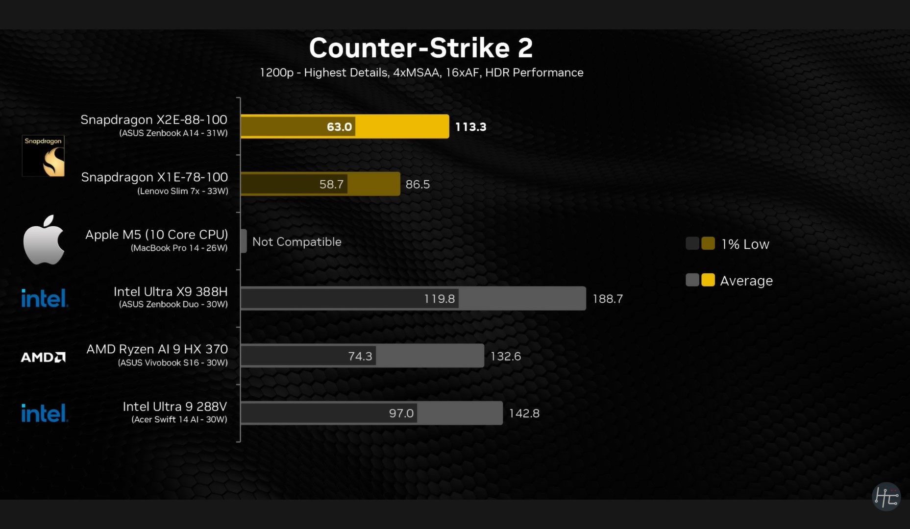 Osserviamo lo stesso schema con Counter-Strike 2, dove lo Snapdragon X2 Elite raggiunge una media di oltre 113 FPS, ma i minimi dell'1% rimangono a 63 FPS. Confrontando questo dato con la media di 188,7 FPS del Core Ultra X9 388H e i minimi dell'1% di 119,8 FPS, il problema diventa abbastanza chiaro.