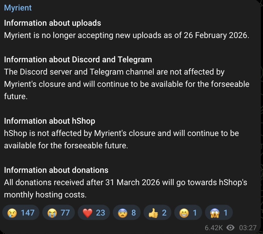 I caricamenti sul servizio sono già stati interrotti e il suo fondatore, Alexey, ha esortato gli utenti a scaricare i contenuti che desiderano finché i server rimarranno online. Myrient, fin dalla sua nascita, ha sempre funzionato come servizio privo di annunci pubblicitari, sostenendosi esclusivamente sulle donazioni dei suoi clienti, e non presentava nemmeno limiti di download.