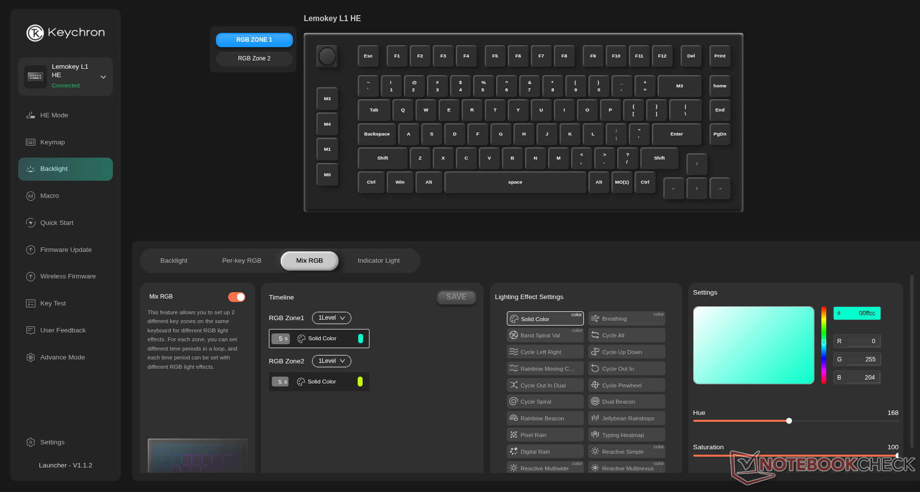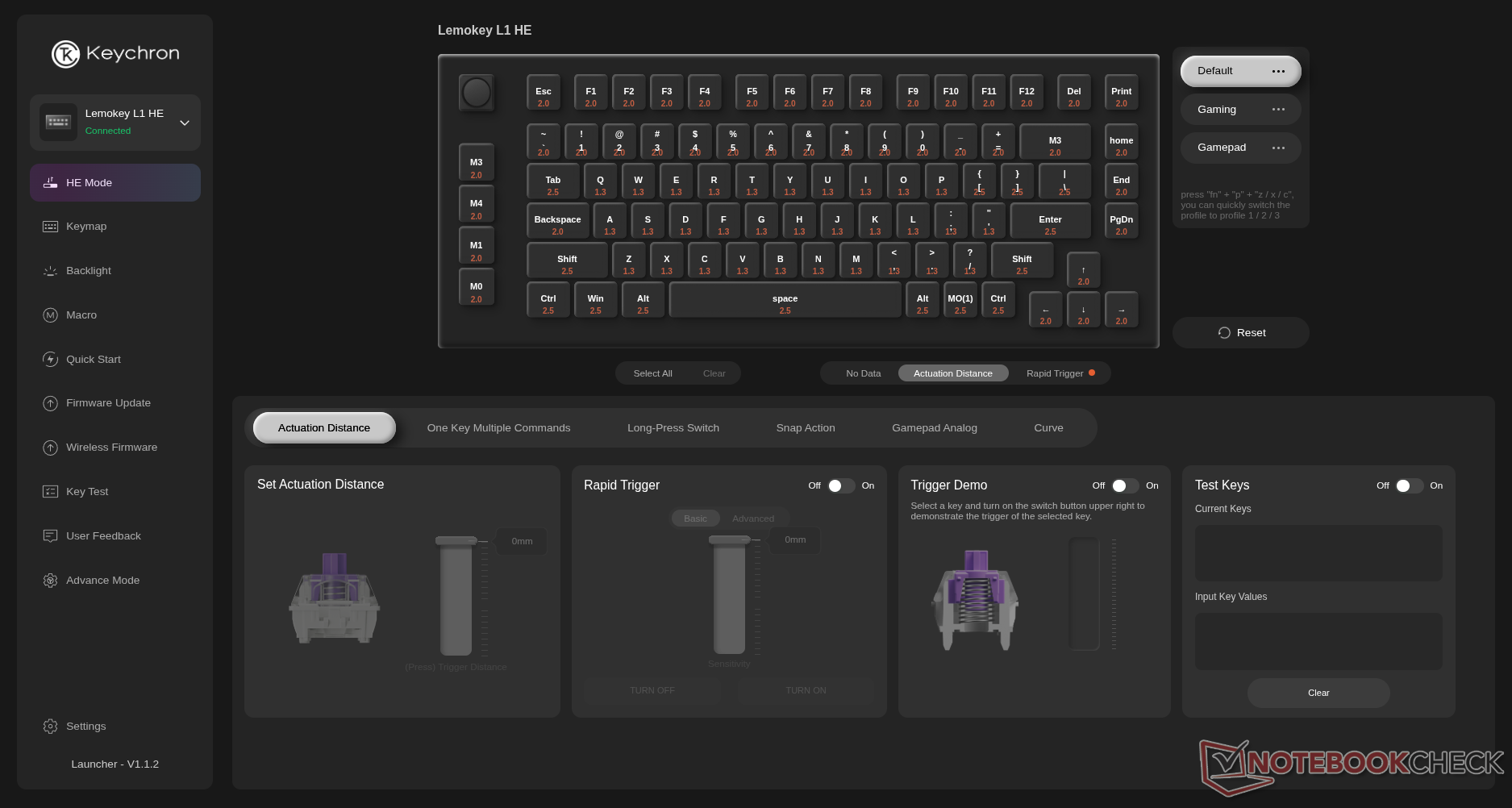 La personalizzazione tramite Keychron o Lemokey Launcher - i due driver web sono identici per funzionalità e layout - è eccellente, con una vera personalizzazione RGB per tasto, una personalizzazione delle macro e tutte le caratteristiche di effetto Hall che ci aspettiamo dalle tastiere da gioco di Keychron - distanza di attuazione, snap tap, DKS, trigger rapido e persino modalità analogica per l'emulazione del controller. Come al solito, Keychron è uno dei pochi marchi che offre quest'ultima funzione, oltre a Wooting. Curiosamente, la nostra unità di recensione presentava un problema che faceva sì che i tasti nel display del Launcher non riflettessero le impostazioni di retroilluminazione RGB che erano correttamente visualizzate sulla tastiera. Probabilmente si tratta di un problema della nostra unità o di un bug del firmware che verrà risolto. In ogni caso, è stato abbastanza facile risolvere il problema guardando la tastiera quando si applicano le impostazioni.