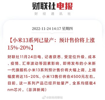 Secondo quanto riportato da https://m.cls.cn/detail/1193610 che la serie Xiaomi 13 potrebbe avere un prezzo superiore del 15%-20% rispetto agli smartphone della gamma Xiaomi 12. Mentre il normale Xiaomi 12 è stato rilasciato in Cina con un prezzo di 3.699 yuan (attualmente circa 517 dollari), il modello base della gamma Xiaomi 13 potrebbe costare circa 4.500 yuan (629 dollari), secondo un'agenzia in lingua cinese.