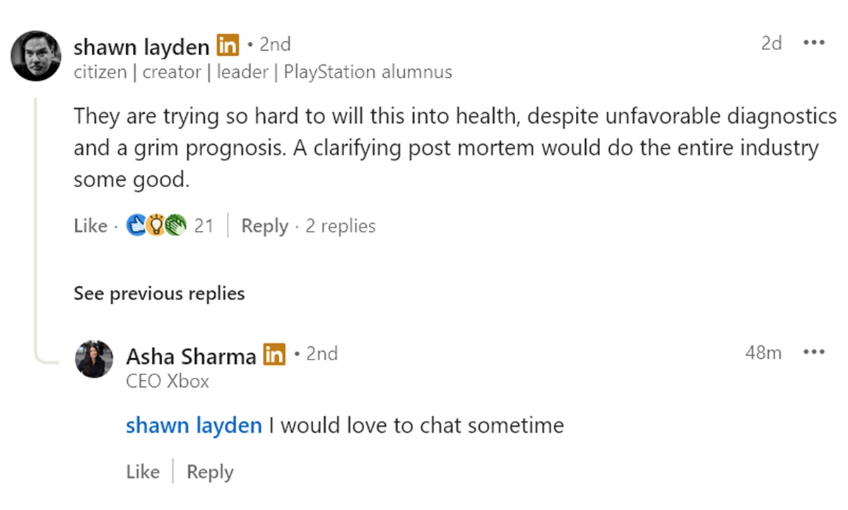 Nonostante le sue concessioni, l'ex capo di SIE non è convinto che si possa salvare. Su LinkedIn, Layden ha sostenuto: