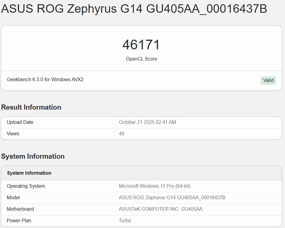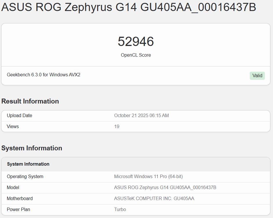 Al massimo, l'iGPU del Core Ultra X7 358H all'interno del ROG Zephyrus G14 ha ottenuto un punteggio di 52.946 nel benchmark Geekbench 6.5 OpenCL. All'estremo inferiore, il punteggio è stato di 46.171. Ci sono anche altri elenchi con punteggi che si collocano tra queste due cifre.