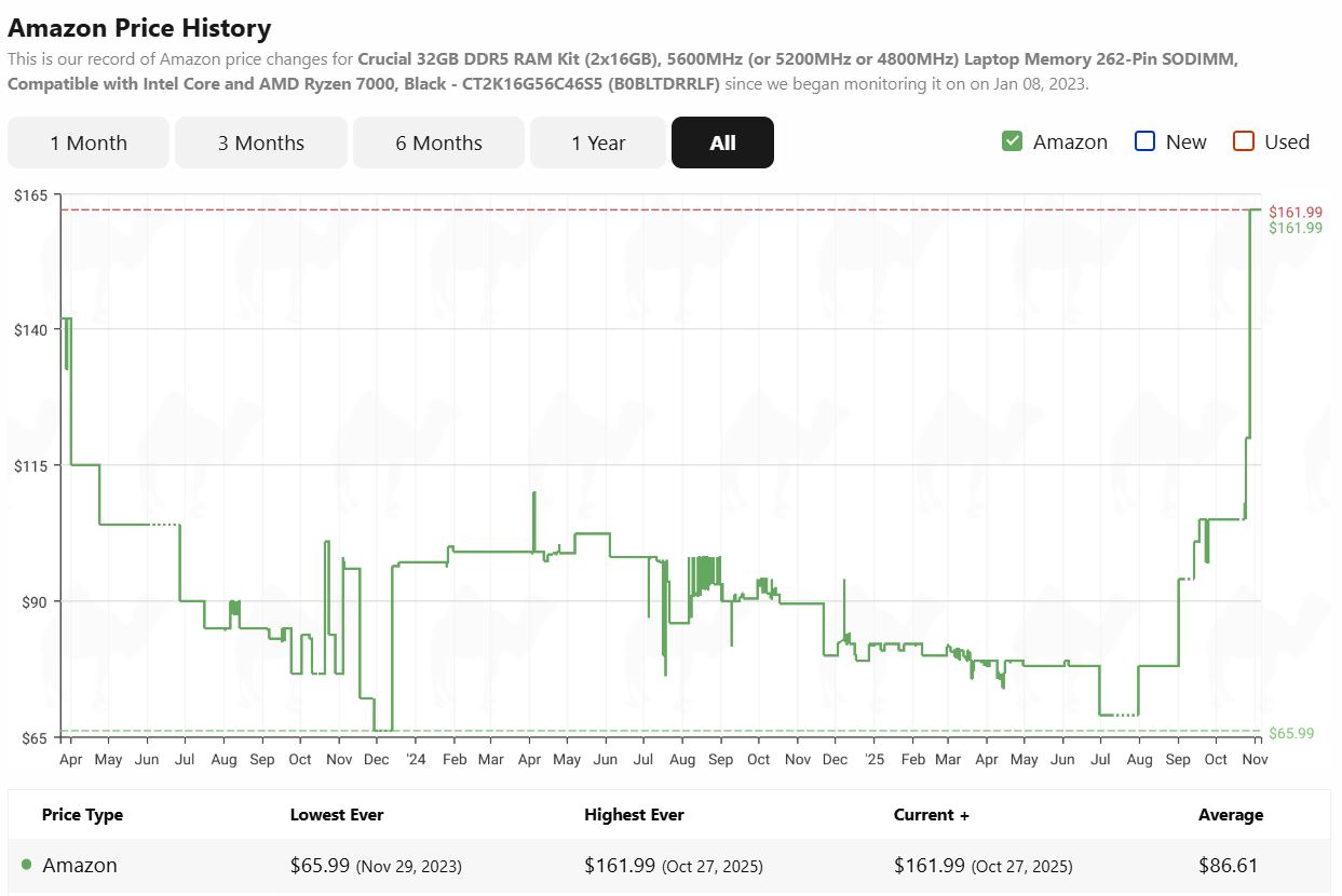 Ad esempio, il kit di memoria più venduto su Amazon, il kit da 32 GB DDR5-5600 di Crucial, è attualmente in vendita a 161,99 dollari, un aumento di 2,75 volte rispetto al prezzo minimo storico di 65,99 dollari del novembre 2023 (via camelcamelcamel).