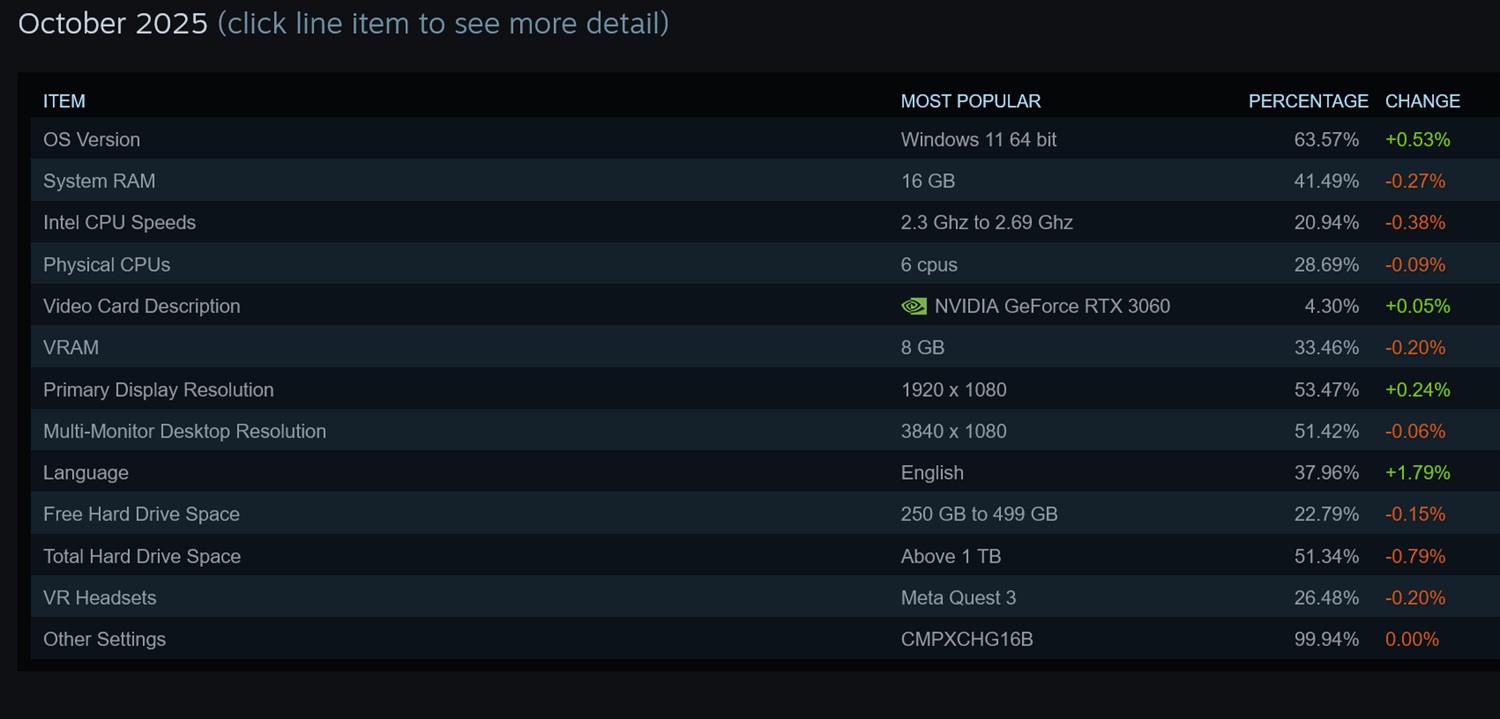 Aldehayyat ha fatto i suoi commenti durante il podcast Tested di Adam Savage su https://www.youtube.com/watch?v=VkW3wTHT-p8&t=739s. I dati hardware tracciati da Valve sembrano convalidare le sue affermazioni. Una delle preoccupazioni degli acquirenti riguarda gli 8 GB di VRAM della GPU AMD RDNA 3 semi-custom della Steam Machine. Tuttavia, con il 33,46% nel sondaggio di ottobrequesta capacità di memoria corrisponde alla configurazione più comune.