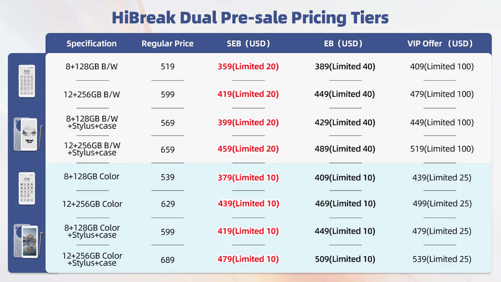 Lo smartphone è offerto in un totale di otto varianti. È disponibile con 8 GB o 12 GB di RAM e 128 GB o 256 GB di spazio di archiviazione, con ogni configurazione offerta anche in una versione con o senza display E Ink a colori. Gli acquirenti possono ordinare solo HiBreak Dual E-Ink o un bundle con una custodia e uno stilo. Il prezzo di vendita regolare dichiarato va da 519 a 689 dollari, anche se si prevede che i prezzi di preordine includano sconti sostanziali. È probabile che questi siano limitati principalmente dalla quantità piuttosto che dal tempo. Si prevede che le prime 20 unità della versione base saranno vendute a 359 dollari, dopodiché il prezzo salirà a 389 dollari e poi a 409 dollari. La versione top-end con 12 GB, 256 GB, uno stilo e una custodia protettiva ha un prezzo di 479 dollari, 509 dollari e 539 dollari.