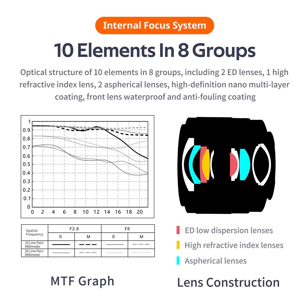 La costruzione ottica comprende due elementi ED, un elemento ad alto indice di rifrazione e due asferici per ridurre al minimo l'aberrazione cromatica e sferica. L'elemento frontale è dotato di un rivestimento multistrato resistente all'acqua e antimacchia per evitare le sbavature. La distanza minima di messa a fuoco ravvicinata è di 19 cm, il che lo rende adatto a primi piani e selfie.