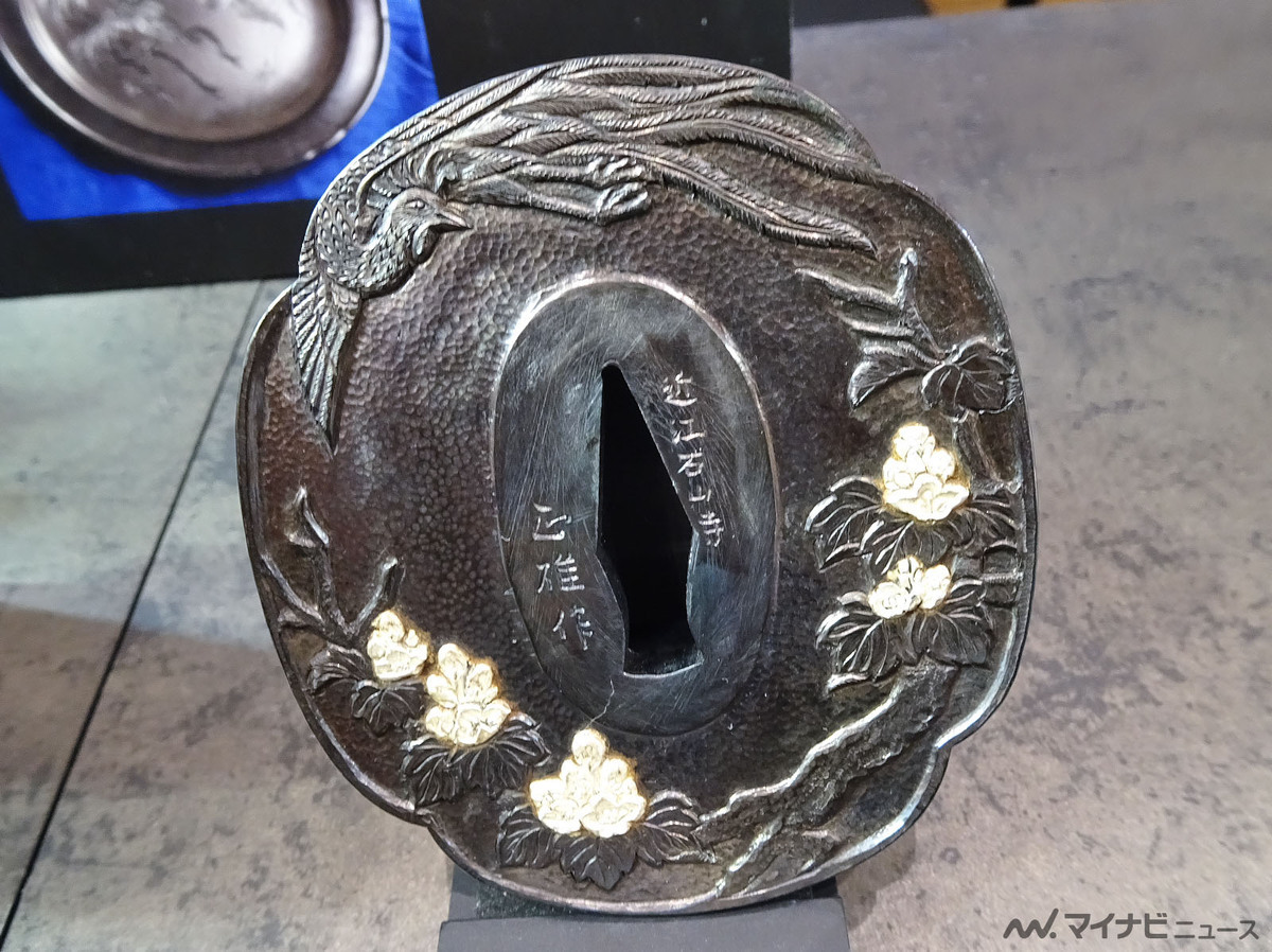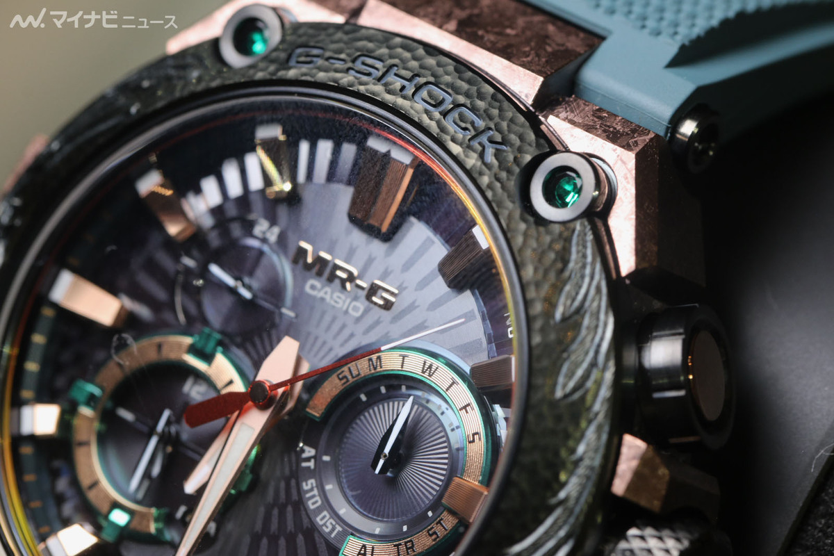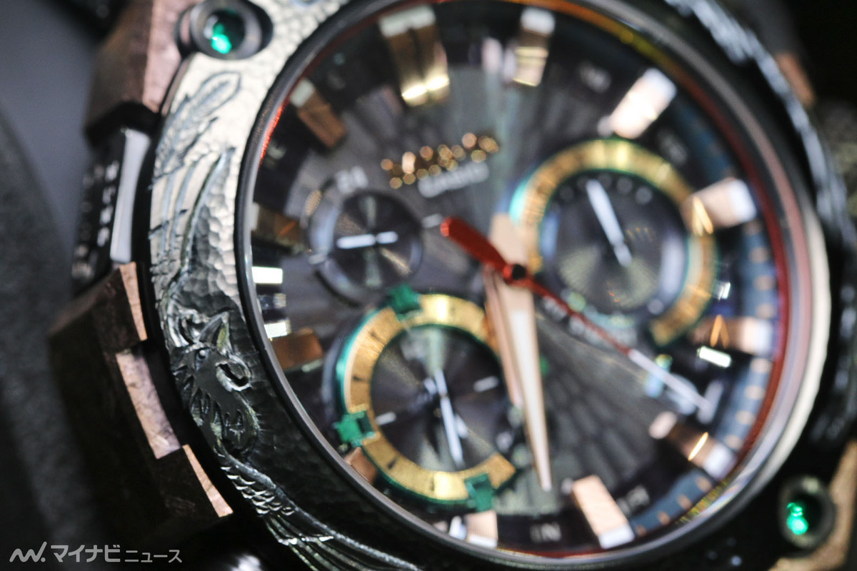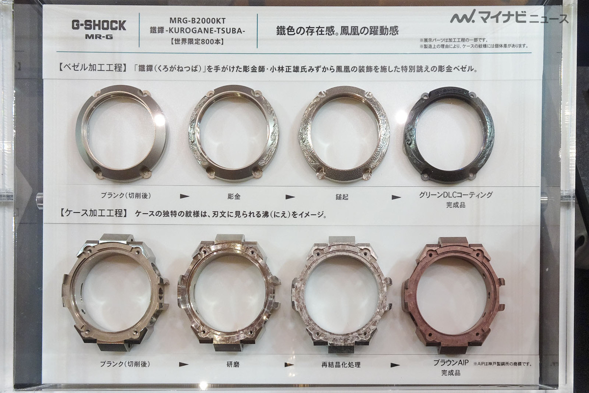I dettagli della corona testurizzata e della lunetta dell'MRG-B2000KT-3A appaiono ancora più intricati. Vale la pena notare che il cinturino in durasoft appare più blu che verde in queste immagini. Oltre all'orologio, all'evento è stata esposta una tsuba di spada giapponese, che si dice abbia ispirato il design del segnatempo. Anche questo è stato realizzato da Masao Kobayashi, l'artigiano che ha inciso a mano questi orologi Casio. C'erano anche esposizioni che illustravano i processi di incisione della lunetta e di finitura della cassa.