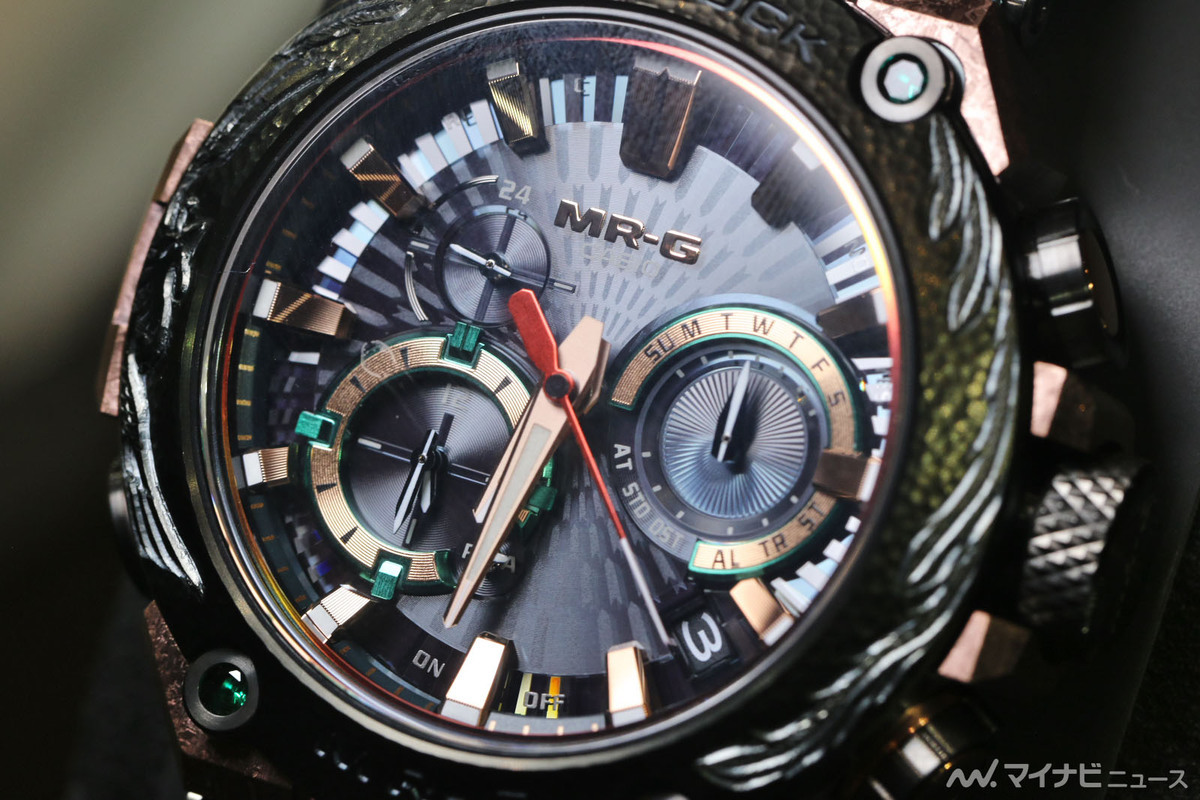 Le foto di Casio G-Shock MRG-B2000KT-3A, condivise da MyNews Navi da un evento in Giappone, offrono un nuovo sguardo su questo orologio analogico di alta qualità. Il quadrante è ancora più sorprendente nella realtà rispetto alle immagini di marketing, con un motivo a punta di freccia più brillante e indici dei minuti altamente riflettenti. Attraverso queste immagini, si può anche apprezzare più dettagliatamente la finitura a coste degli indici delle ore e degli anelli degli indicatori. Le immagini catturano anche il rivestimento DLC verde sulla lunetta incisa a mano, con varie sfumature di verde e giallo che si vedono quando cattura la luce.