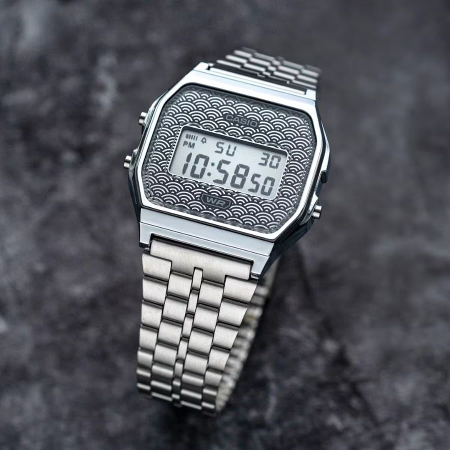Il modello Casio A159WEVJ-2 ha un quadrante blu con motivo seigaiha e onde, mentre il modello A159WEVJ-7 presenta lo stesso design in argento. Entrambi i modelli hanno una cassa e una lunetta in resina cromata color argento, con un cinturino in acciaio inossidabile abbinato. Inoltre, ciascuno di essi presenta un display con sfondo chiaro e cifre scure.