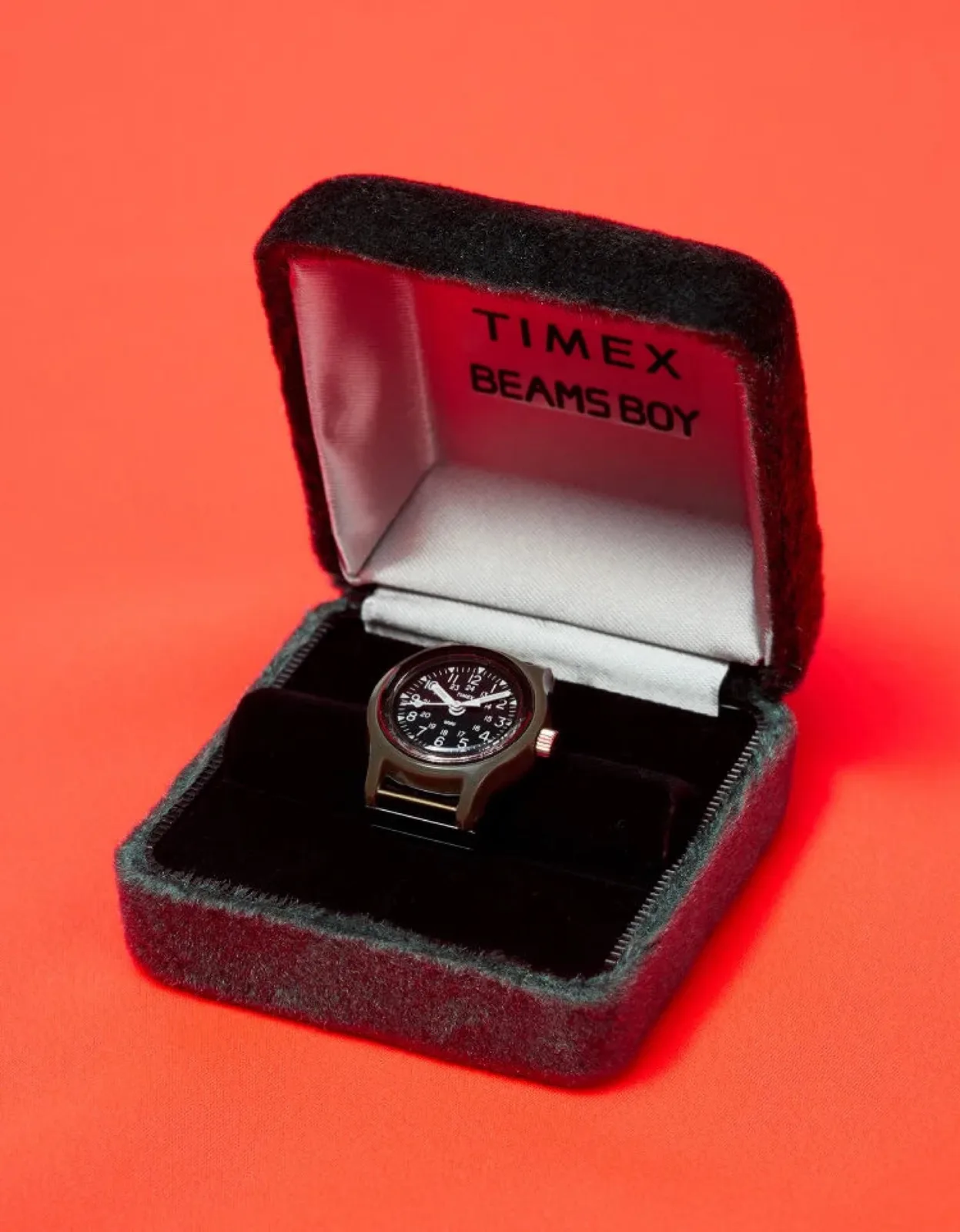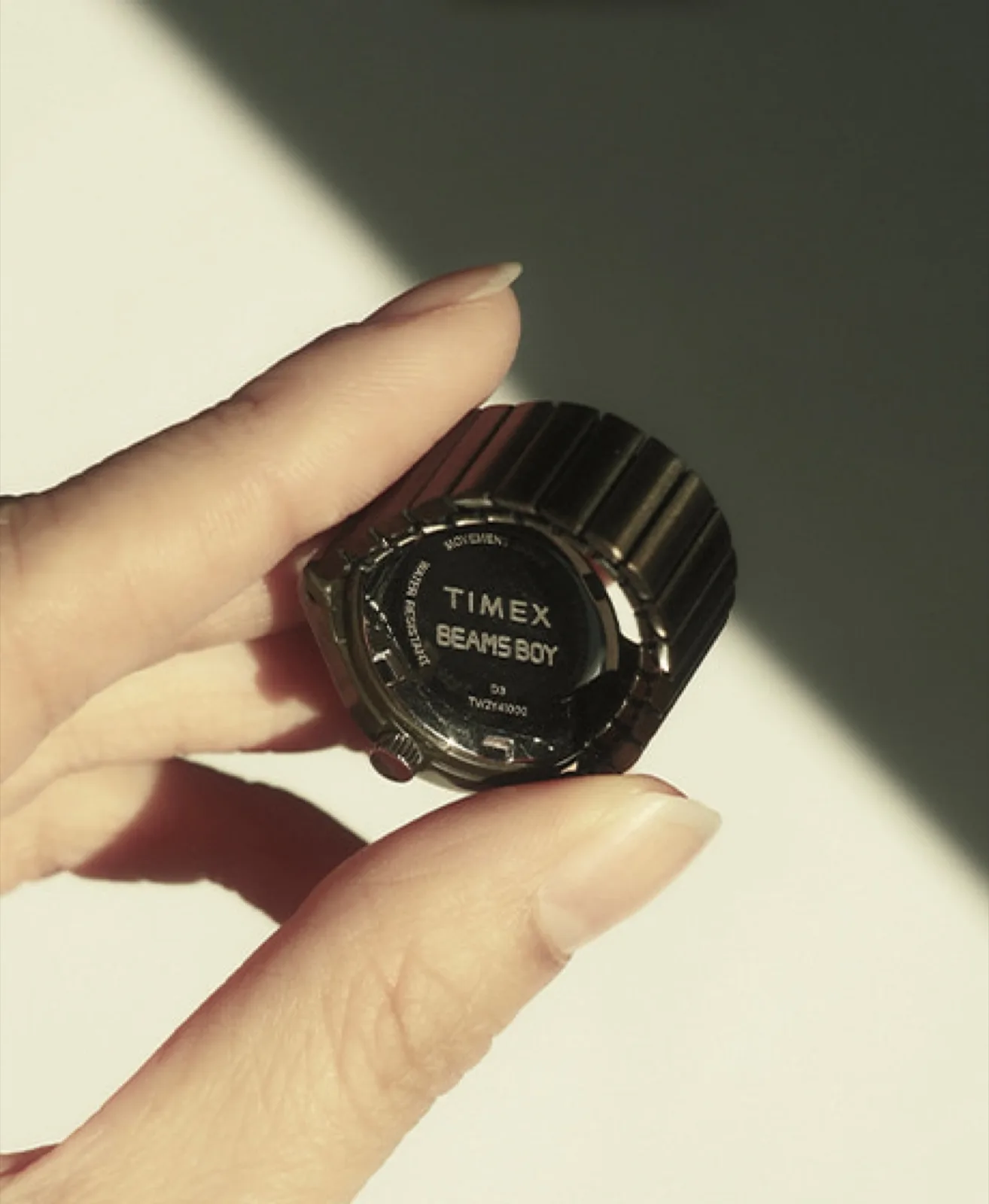 Questo perché è realizzato in acciaio inossidabile e i singoli elementi sono collegati da una fascia elastica. Questo dovrebbe rendere l'orologio ad anello adatto alle dita su cui di solito si indossa un anello di dimensioni comprese tra 9 e 15. Tuttavia, non è possibile rimuovere una maglia del bracciale per renderlo adatto a dita ancora più piccole. Tuttavia, non è possibile rimuovere una maglia del bracciale per renderlo adatto a dita ancora più piccole. L'orologio ad anello Timex x Beams Boy sarà lanciato in aprile per celebrare il 50° anniversario del primo negozio Beams di Harajuku, in Giappone.