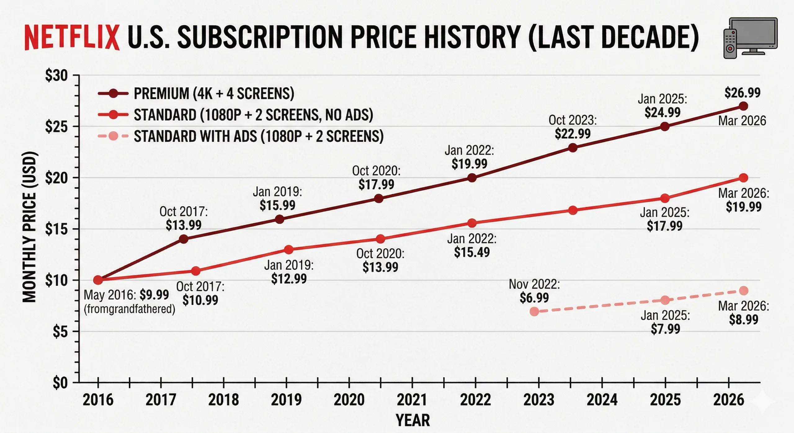 Netflix ha appena aumentato i prezzi degli abbonamenti negli Stati Uniti per la seconda volta in un anno. I nuovi calcoli iniziano a sembrare una tassa diretta sul suo hardware. A partire dal 26 marzo 2026, il livello Premium 4K è salito a 26,99 dollari al mese, mentre il livello base con supporto pubblicitario sembra essere più ancorato a 8,99 dollari. Questo crea un enorme divario di prezzo che in pratica obbliga a scegliere tra due cose che un tempo erano considerate standard: la risoluzione del suo schermo e la privacy delle sue abitudini. Se ha acquistato un computer portatile di fascia alta come un MacBook Pro M5 proprio per la sua luminosità di picco di 1.600 nit e per il display Mini LED, ora Netflix le fa pagare una grossa tassa annuale solo per vedere cosa può fare effettivamente quello schermo.