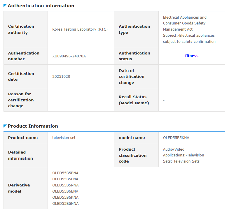È possibile che questi numeri di modello B6 si riferiscano a un'imminente versione 2026 di questo prodotto. Vale la pena sottolineare che, dato che sono elencati con lo stesso certificato, è probabile che il televisore OLED55B5KNA condivida lo stesso hardware di OLED55B6ENA, OLED55B6KNA e OLED55B6NNA.