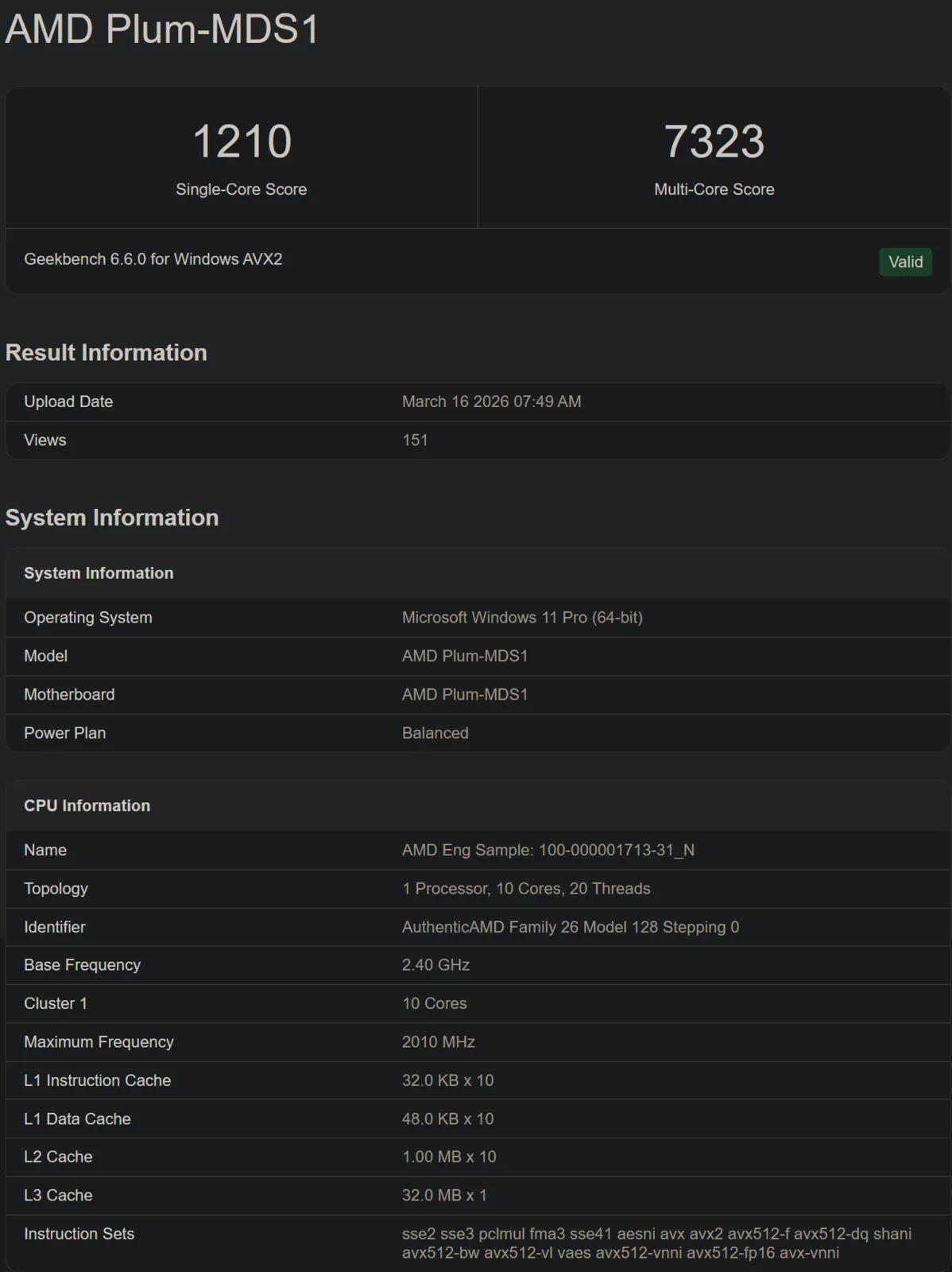 Ottiene 1.210 e 7.323 punti nei test single e multi-core di Geekbench 6.6, rispettivamente. Ha dieci core di CPU e 32 MB di cache, un notevole upgrade rispetto ai 24 MB offerti da Gorgon Point. Trattandosi di un campione ingegneristico, il Ryzen AI 9 565 testato qui non funziona al massimo della sua capacità, come dimostra il suo boost clock di 2,3 GHz.