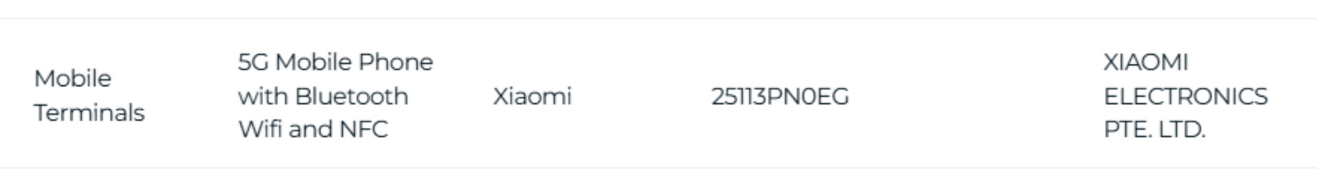 Ora, quella che sembra essere la versione globale dello Xiaomi 17 è comparsa nel database pubblico dell'Infocomm Media Development Authority (IMDA) di Singapore. In particolare, l'ente normativo ha certificato '25113PN0EG', come mostra l'immagine qui sotto. In base alla nomenclatura dei numeri di modello di Xiaomi, 25113PN0EG dovrebbe essere la versione globale di 25113PN0EC, un numero di modello assegnato alla versione cinese dello Xiaomi 17.