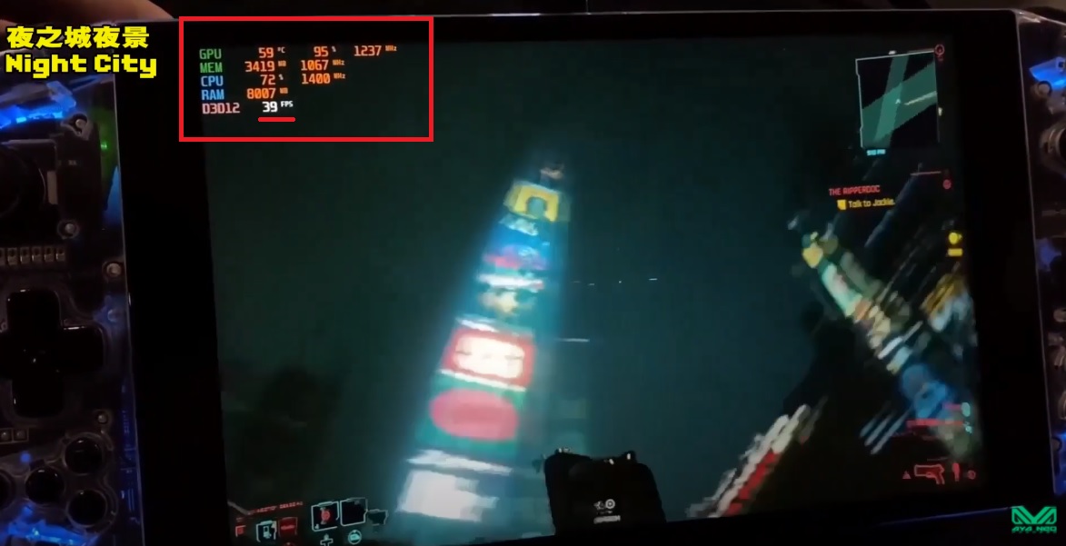 Insieme a 16 GB di RAM veloce (@4266 MHz) la console AYA NEO Founder vanta un display da 7" e una batteria da 47 Wh. Tutto questo ha contribuito a far sì che il dispositivo fosse in grado di far funzionare il pesante Cyberpunk 2077 in genere a circa 30-35 FPS, con alcune parti che arrivano a 20 e persino un breve picco che raggiunge i 39 FPS. Naturalmente, le impostazioni di gioco sono molto probabilmente sul minimo disponibile, ma è comunque una dimostrazione impressionante da una console portatile con un processore a 6 cores e GPU integrata.