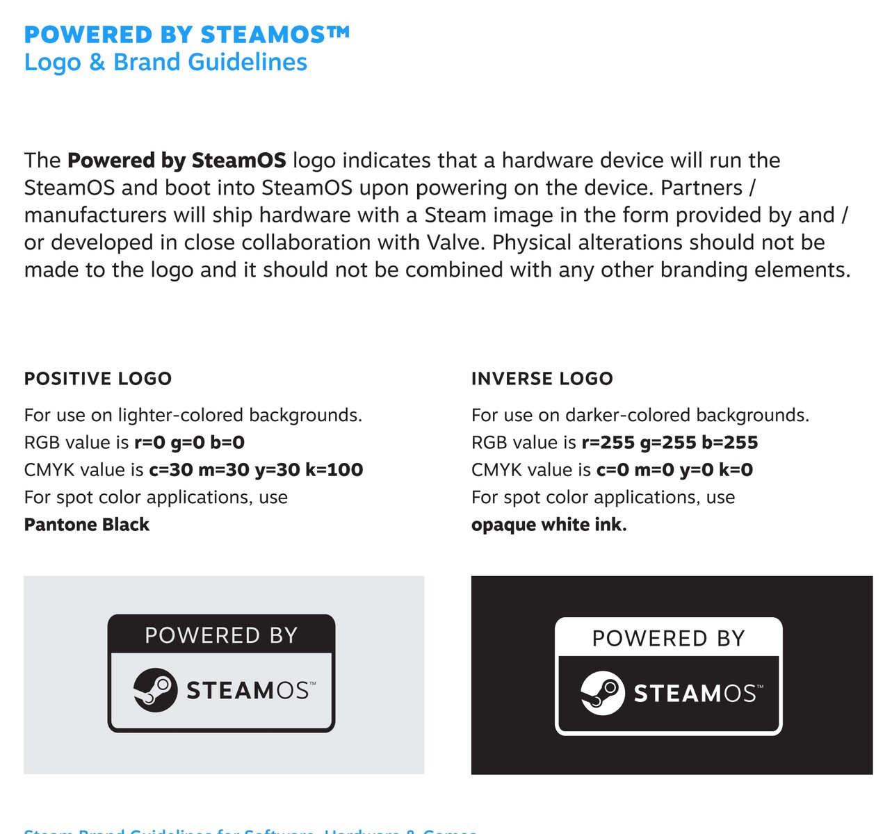 Le linee guida di branding in questione fanno riferimento ai dispositivi "Powered by SteamOS", che Valve spiega ulteriormente come: