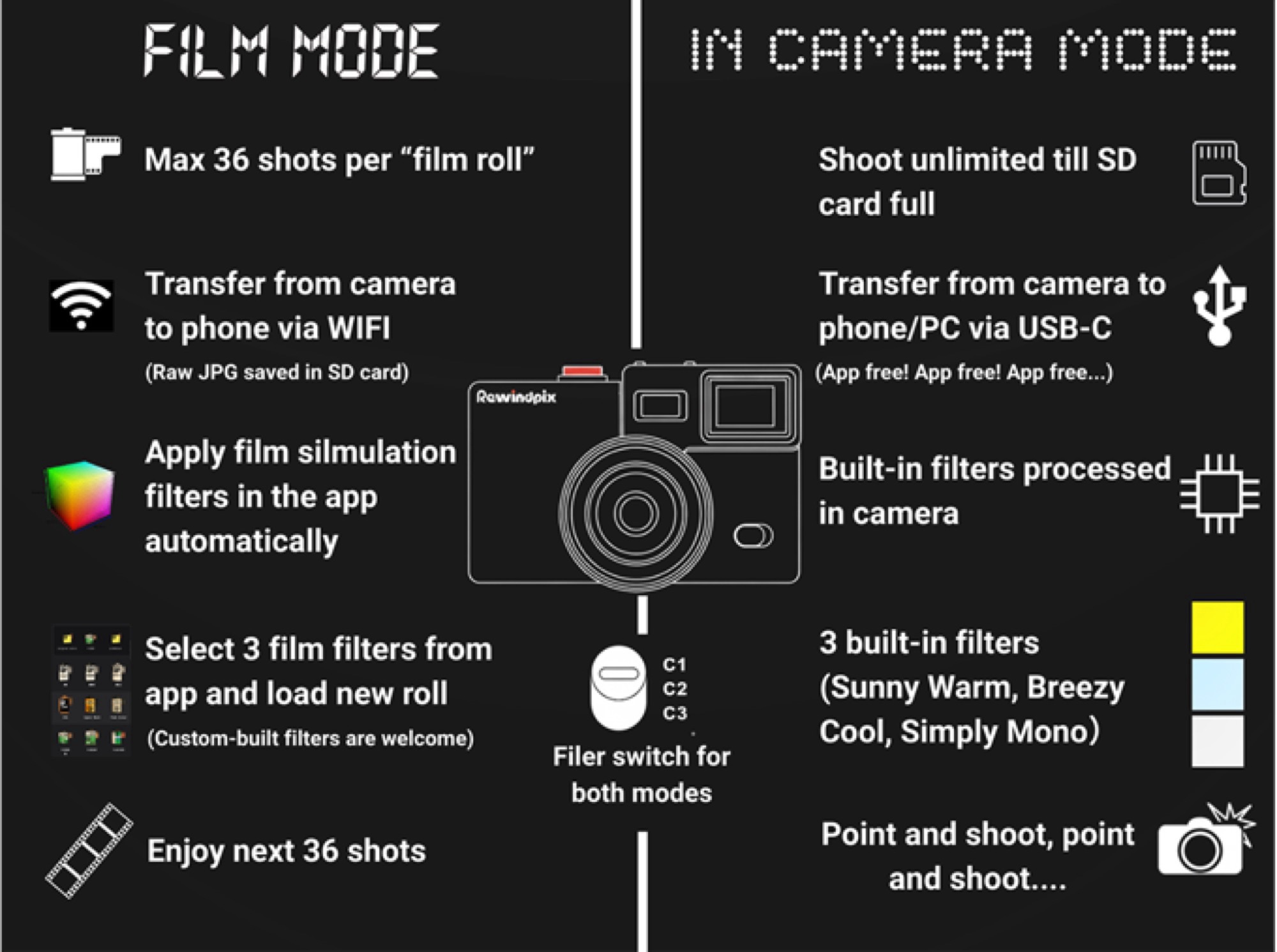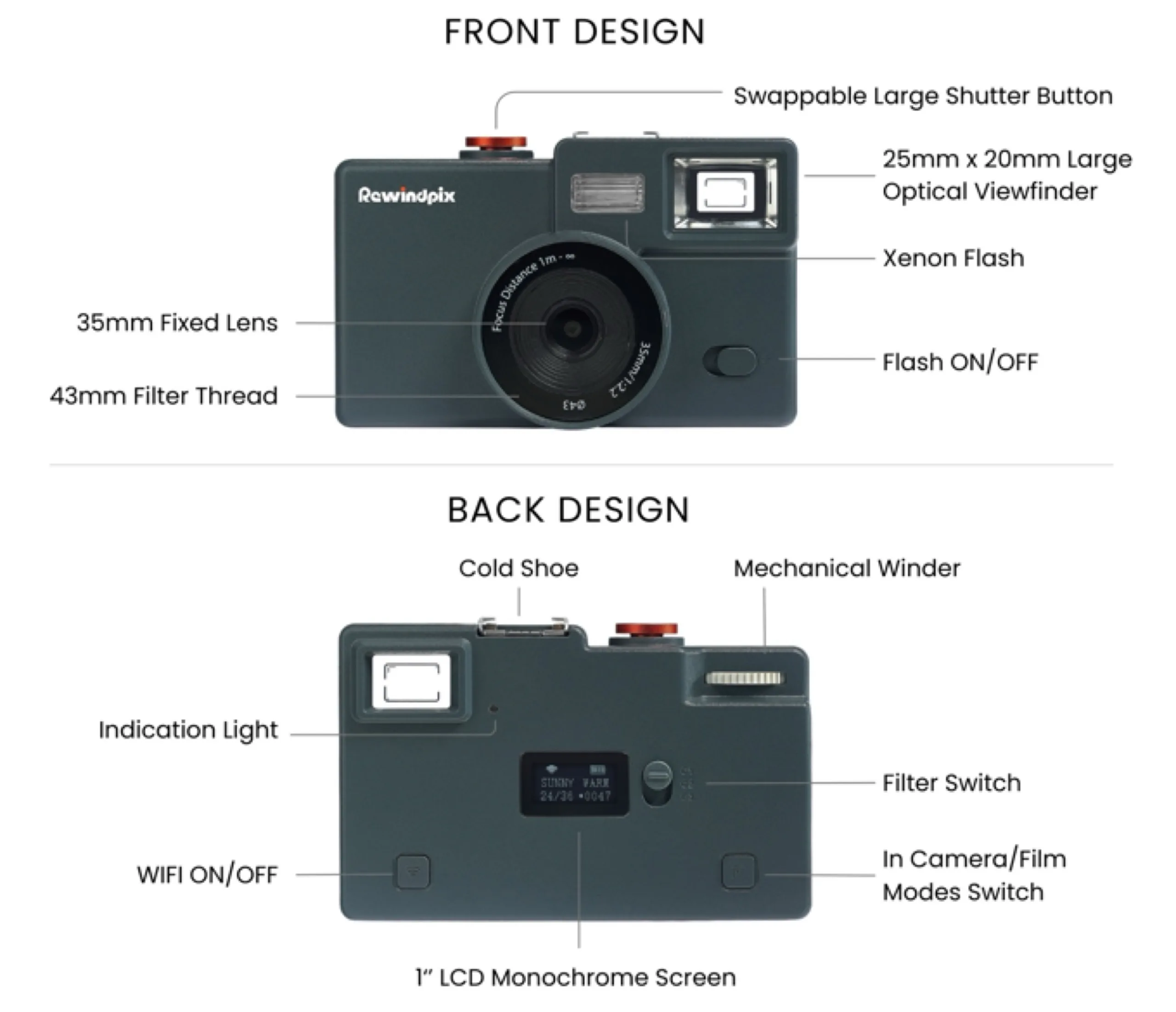 Dopo che la Kodak Charmera ha avuto un clamoroso successo commerciale, Rewindpix sta cercando di costruire su questo successo. Con un prezzo di 119 dollari, la fotocamera è un po' più costosa, ma dovrebbe anche ottenere una migliore qualità dell'immagine, in quanto Rewindpix utilizza un sensore da 13 megapixel in formato 1/3,06 pollici, abbinato a un obiettivo da 35 mm f/2,2.