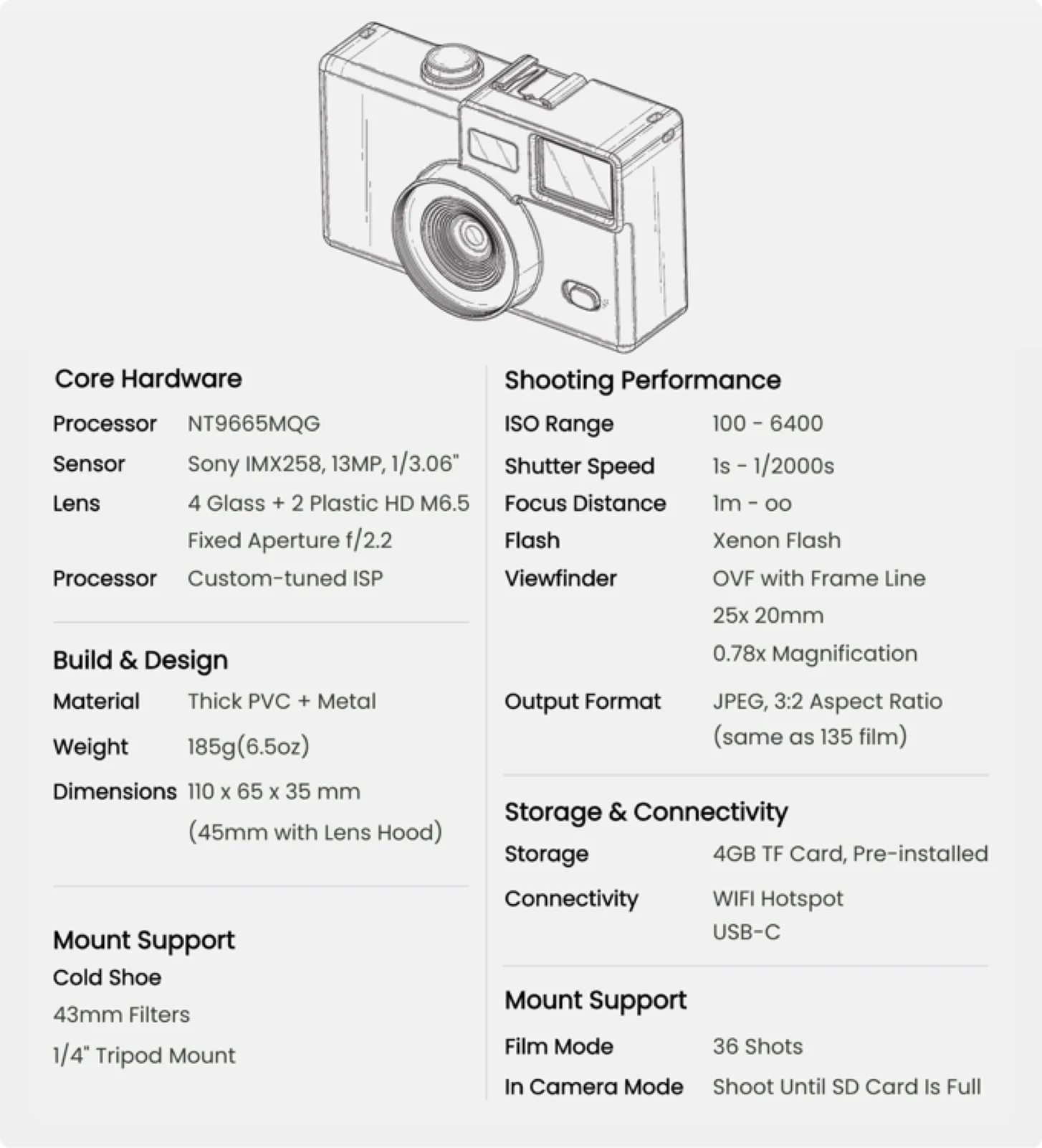In secondo luogo, i rullini virtuali possono essere inseriti tramite l'app per smartphone associata, che sblocca un filtro e un numero limitato di foto. Le foto possono essere visualizzate solo dopo che l'intero rullino è stato trasferito sullo smartphone, per il quale la fotocamera supporta il Wi-Fi. Questa "modalità film" può anche essere disattivata, se lo si desidera. Un display da 1 pollice sul retro della fotocamera da 185 grammi mostra i dettagli sulla batteria e sulla memoria disponibile. Una scheda microSD da 4 GB è inclusa nella fornitura.