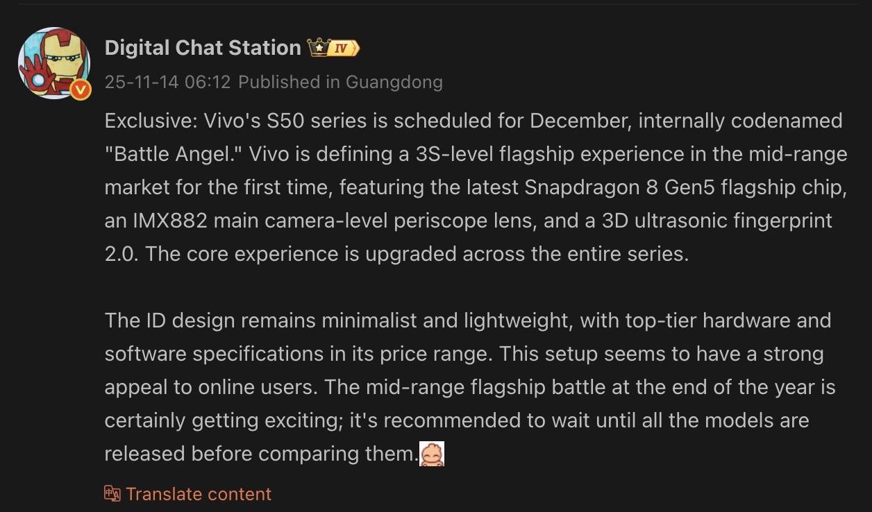 Non è chiaro se anche la serie S50 sarà caratterizzata da due modelli come il suo predecessore. Il tipster Digital Chat Station ha suggerito in precedenza che la serie sarà caratterizzata da un modello compatto, probabilmente con il marchio S50 Pro Mini. In una nuova fuga di notizie su https://weibo.com/6048569942/QdLymnukp?pagetype=profilefeedil tipster sostiene che la serie Vivo S50 utilizzerà il nuovo Qualcomm Snapdragon 8 Gen 5 snapdragon 8 Gen 5. Si tratta di un chip sub-flagship. Si tratta di un chipset sub-flagship di Qualcomm, posizionato al di sotto dello Snapdragon 8 Elite Gen 5. Come riferimento, l'S30 standard utilizzava lo Snapdragon 7 Gen 4 e l'S30 Pro Mini utilizzava il Dimensity 9300 Plus.