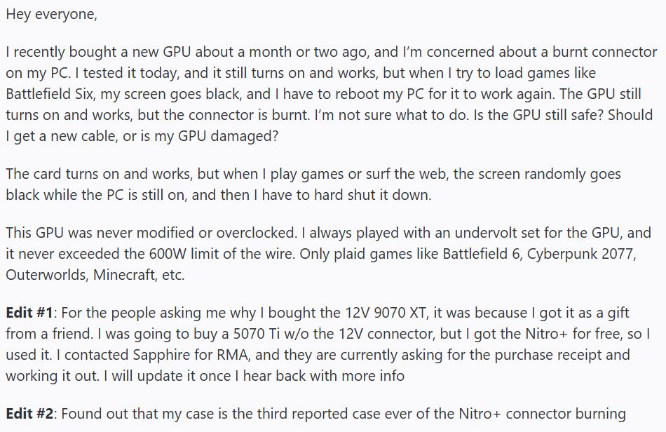 Sebbene Nvidia abbia utilizzato una versione riveduta del connettore nella serie RTX 50, ci sono state comunque segnalazioni di nuovi cavi 12V-2x6 non funzionavano. In questo caso, la decisione di AMD di non utilizzare il 12VHPWR e l'ultimo 12V-2x6 ha risparmiato all'azienda molti incubi a livello di PR. Tuttavia, ci sono ancora alcuni modelli AIB Radeon che si affidano a 12VHPWR/12V-2x6. Una di queste schede è la Sapphire Nitro+ RX 9070 XT che, secondo un post di su r/pcmasterrace, è stata vittima di un guastoè stata vittima di un connettore 12VHPWR bruciato.
