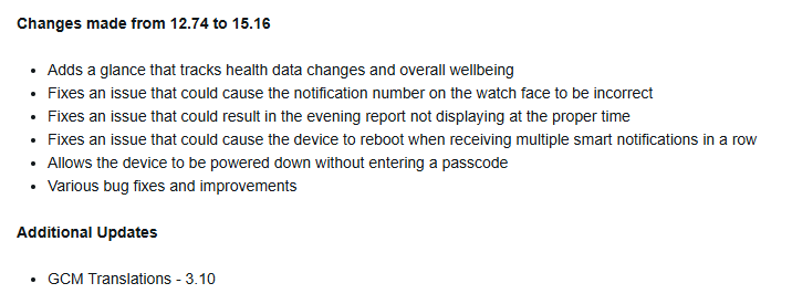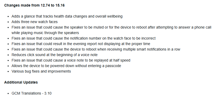 Il registro delle modifiche della versione 15.16 indica che il volume del suono del clic riprodotto quando inizia una nota vocale è stato ridotto. Garmin ha risolto un problema che poteva causare l'errato silenziamento dell'altoparlante quando si cercava di rispondere a una telefonata. Ha anche risolto i problemi legati al numero di notifica visualizzato sul quadrante dell'orologio e all'ora sbagliata visualizzata nel Bollettino della Sera. Inoltre, Garmin Connect Mobile Translations è stato aggiornato alla versione 3.10, anche se non è chiaro quali siano i vantaggi per gli utenti.