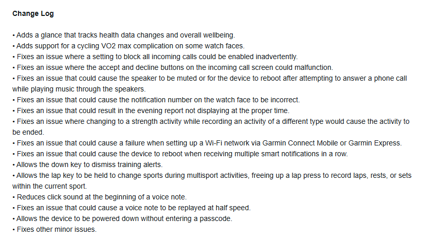 Dopo aver installato la versione beta 15.07, gli utenti degli smartwatch Forerunner 570 e Forerunner 970 potranno utilizzare il tasto giù per eliminare gli avvisi di allenamento, tenere premuto il tasto lap per passare da uno sport all'altro durante un'attività multisport e spegnere il dispositivo senza passcode. Oltre a questo, c'è un'ampia gamma di correzioni di bug che affrontano problemi legati alle chiamate in arrivo, al rapporto serale e all'attività di forza. Garmin indica anche di aver ridotto il rumore del clic riprodotto all'inizio di una nota vocale. Qui di seguito può trovare uno screenshot del registro completo delle modifiche.