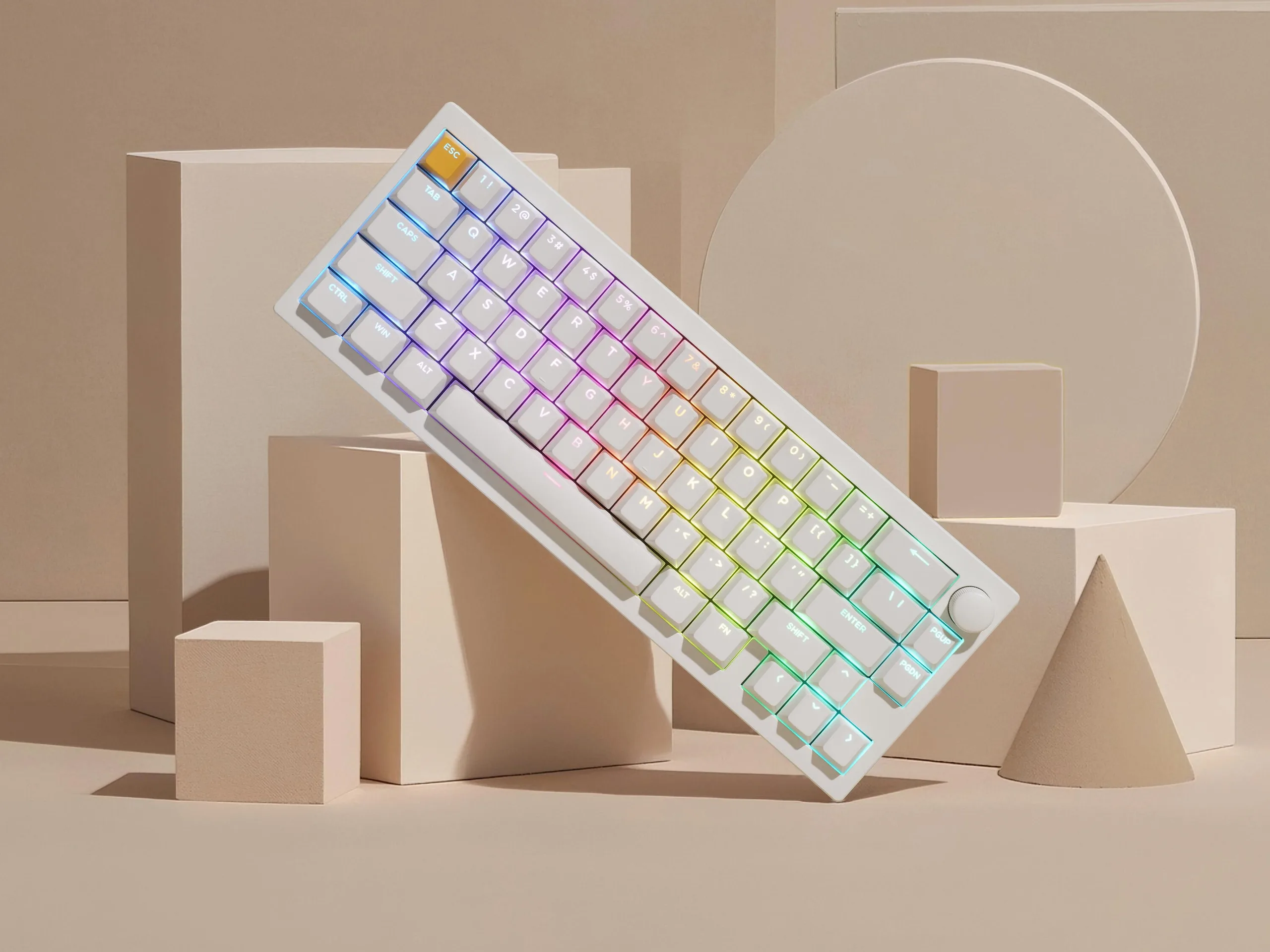 Lemokey P2 HE presenta un layout compatto al 65%, con una manopola del volume personalizzabile, anche se c'è un po' di spazio tra i tasti modificatori della fila inferiore e il gruppo di frecce, per cui sarà probabilmente più facile abituarsi rispetto al layout propriamente compatto con cui abbiamo faticato nel nostro Recensione di Lofree Flow Lite. Un altro punto di forza del P2 HE è che è dotato dei familiari copritasti con profilo Cherry, realizzati in PBT a doppio taglio. Lemokey offre il P2 HE sia in nero che in bianco, ed entrambe le opzioni sono dotate di un'opzione per i keycaps shine-through, che si abbina bene con la retroilluminazione RGB per tasto rivolta a nord.