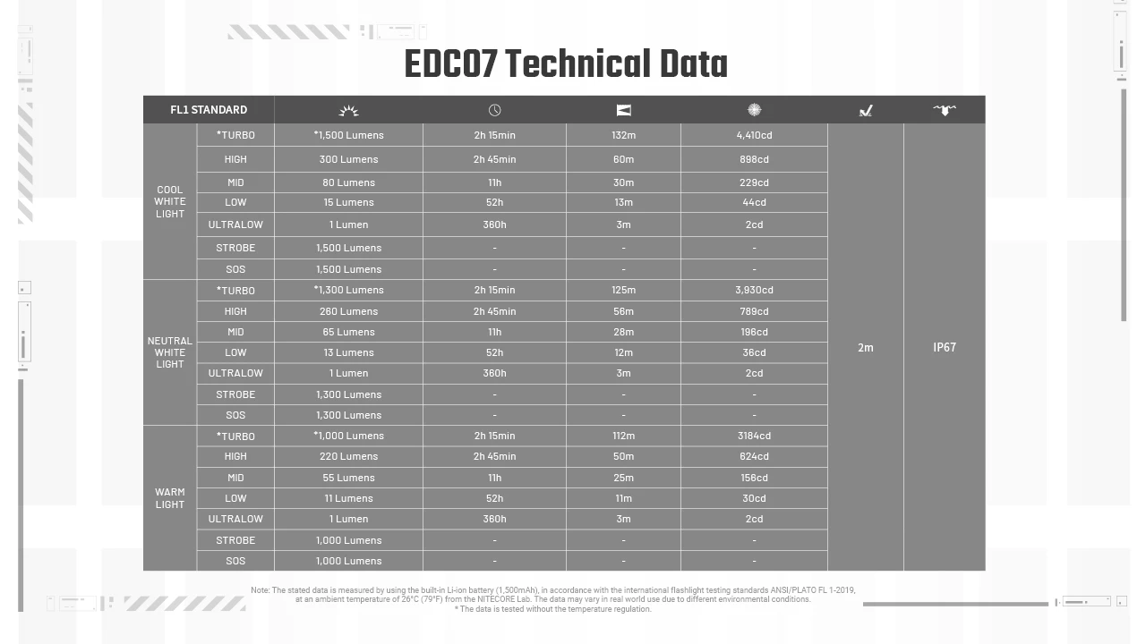 In modalità turbo, che rimane disponibile anche quando la batteria è scarica, purché la torcia non si surriscaldi, Nitecore EDC07 può funzionare per un totale di 2 ore e 15 minuti. La potenza dipende dalla temperatura di colore e varia da 1.000 a 1.500 lumen. Nella modalità più bassa a 1 lumen, può durare circa 380 ore. I tempi di funzionamento sono piuttosto complessi, per questo abbiamo incluso quelli di Nitecore in questo articolo.