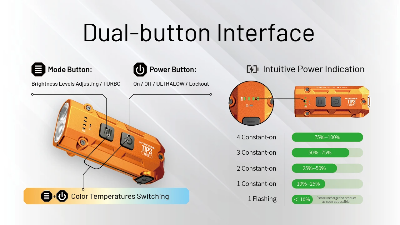 Nitecore è anche riuscita a triplicare il tempo di funzionamento massimo in alcuni casi. Nella sua modalità più debole, a un lumen, il nuovo TIP3 raggiunge un'autonomia di 160 ore. Il TIP 1 SE, invece, raggiunge solo 50 ore. Questo dimostra quanto Nitecore abbia migliorato l'efficienza dei LED in condizioni di scarsa illuminazione.