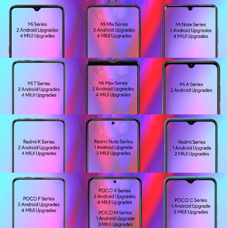 Per quanto riguarda gli smartphones gestiti direttamente da Xiaomi, sembra che tutti i dispositivi a marchio Xiaomi possano aspettarsi quattro aggiornamenti MIUI e due aggiornamenti per Android. Così sono tutti i telefoni della serie Mi, Mi Mix, Mi Max, Mi Note e Mi T (9T, 10T, ecc.). I dispositivi premium di entrambe le gamme Redmi e POCO riceveranno anche il trattamento 4 + 2, con la serie Redmi K, la linea POCO F e i telefoni POCO X inclusi nella parte più supportata di questa politica di aggiornamento non ufficiale.