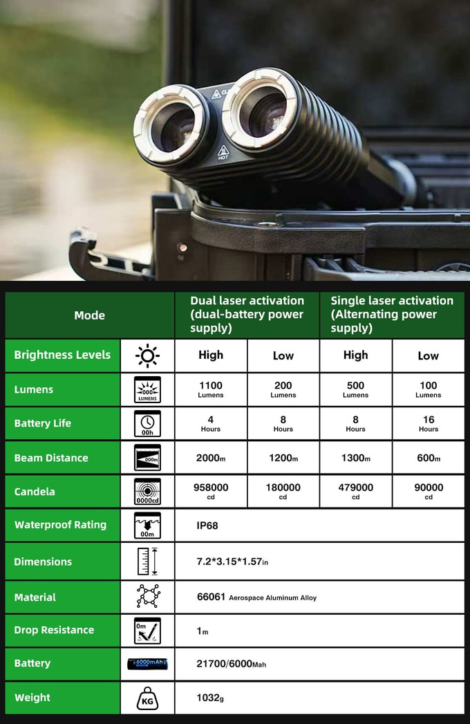 L'involucro è in lega di alluminio di grado aerospaziale 66061 lavorato a CNC. La resistenza alle cadute è valutata fino a 10 metri e il design supera il grado di impermeabilità IP68. Il peso con le batterie è di poco superiore a 1 kg. Sono incluse due batterie agli ioni di litio da 6.000 mAh in formato 21700, con un'autonomia fino a 16 ore di funzionamento a testa singola. La torcia utilizza l'USB Type-C per la ricarica. Ogni barilotto ha interruttori e impostazioni di luminosità separati. La custodia rigida inclusa è dotata di schiuma per la torcia, i filtri, le batterie, la corda intrecciata e il moschettone per una portabilità sicura.